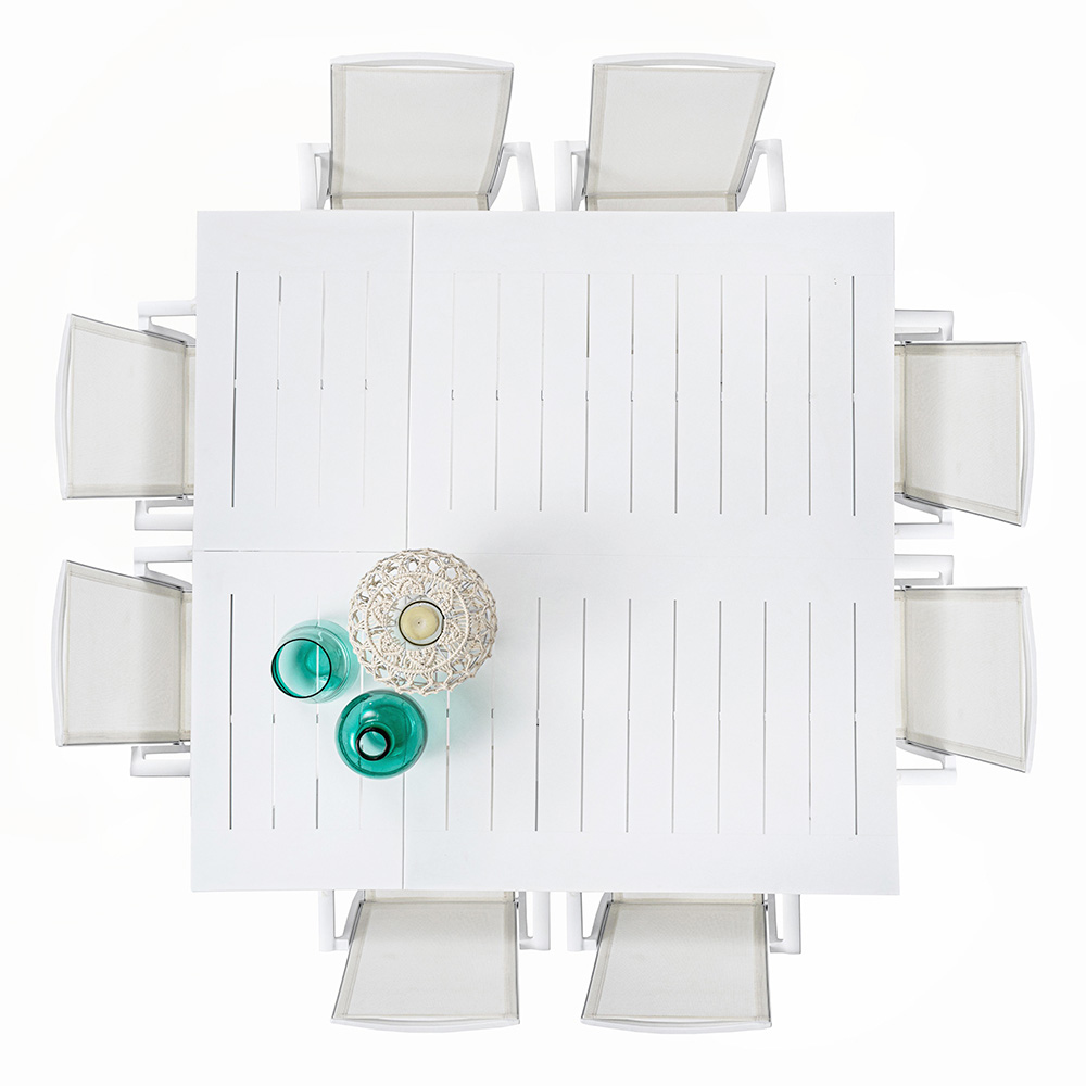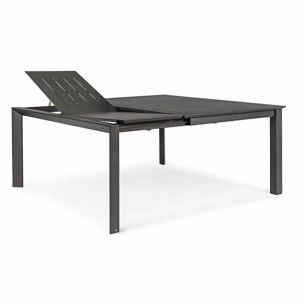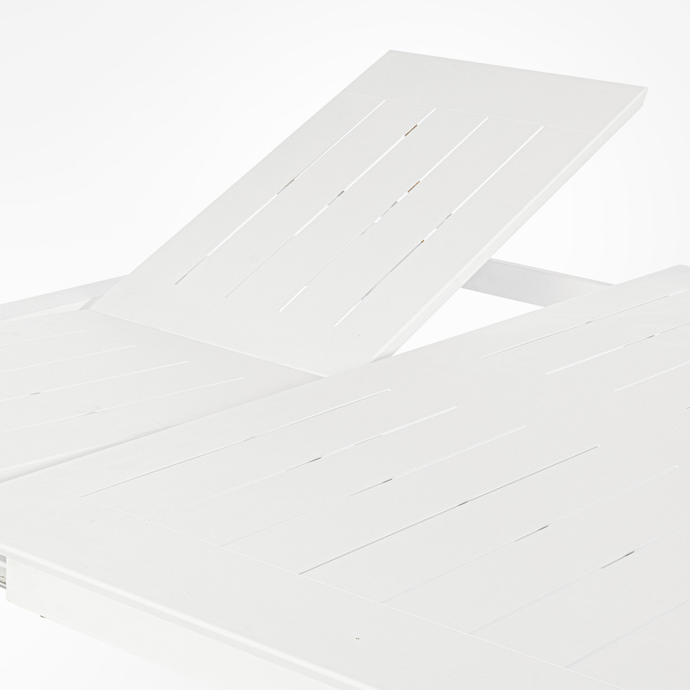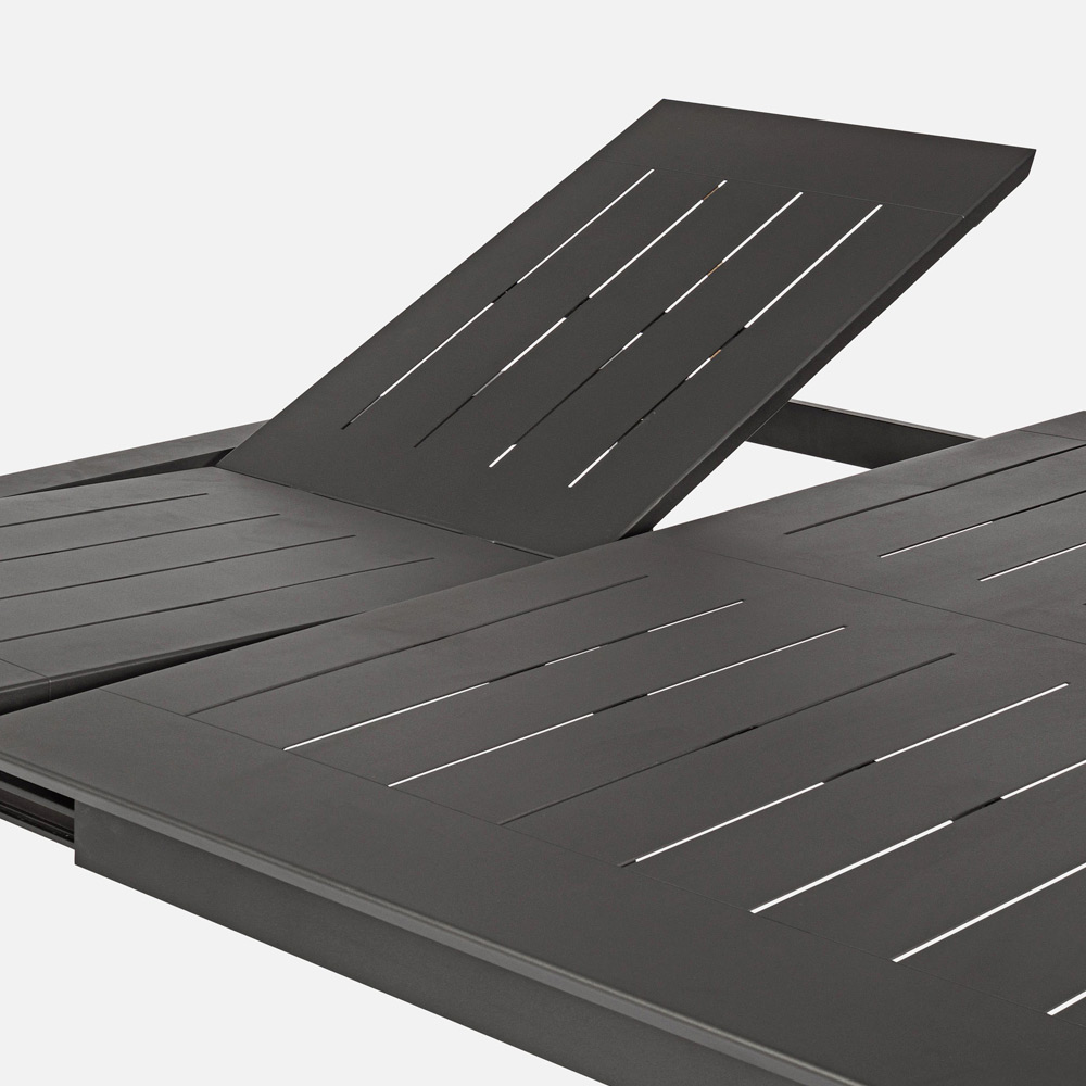 Powder coated aluminum structure (polyester). Extendable with telescopic opening. Stainless steel screws. Legs to assemble.