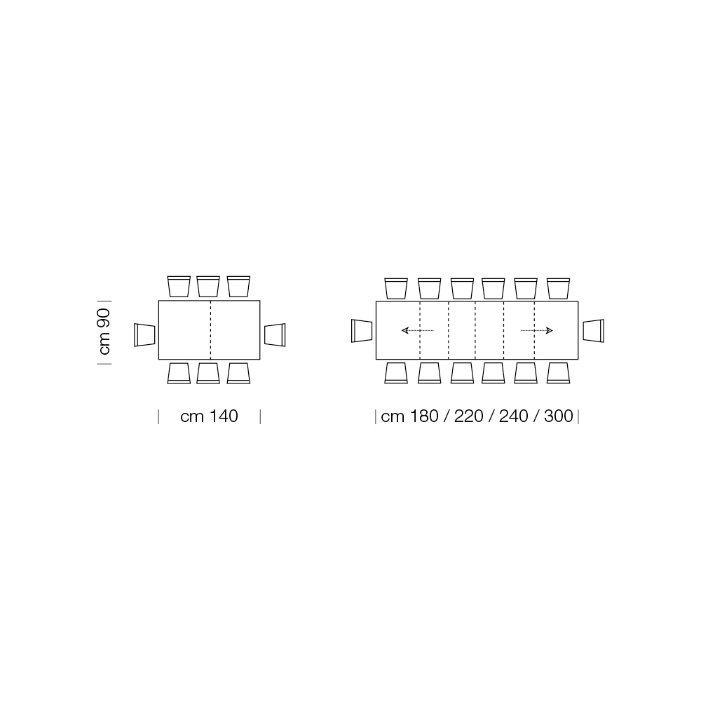 • L 140 (300) x D 90 x H 77 cm 14 seater extendable with four 40cm internal extensions;
