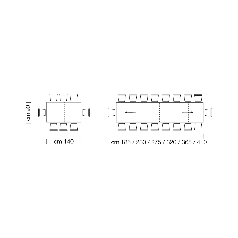 • L 140 (410) x D 90 x H 77 cm 18-seater extendable with six 45cm extensions, three internal and three supplied in a reusable cardboard box;