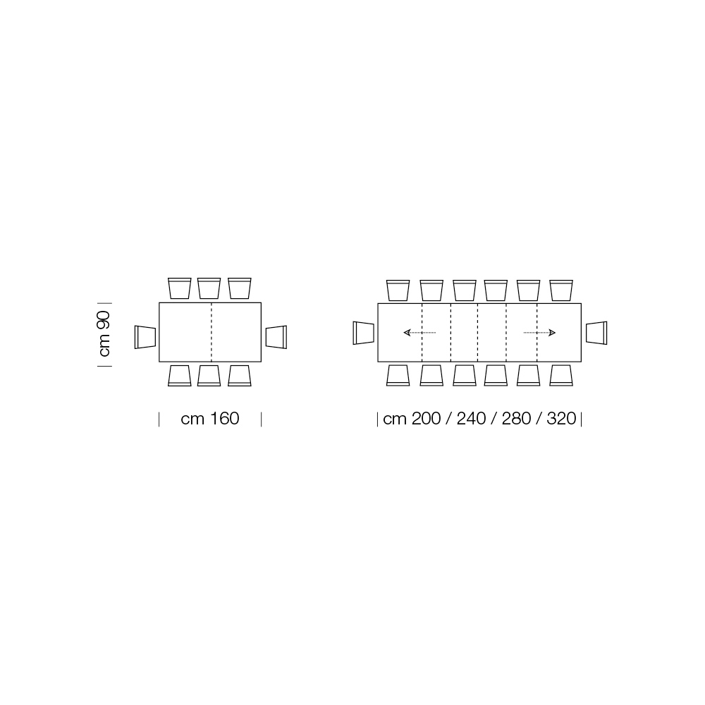 • L 160 (320) x D 90 x H 77 cm 14 seater extendable with four 40cm internal extensions;