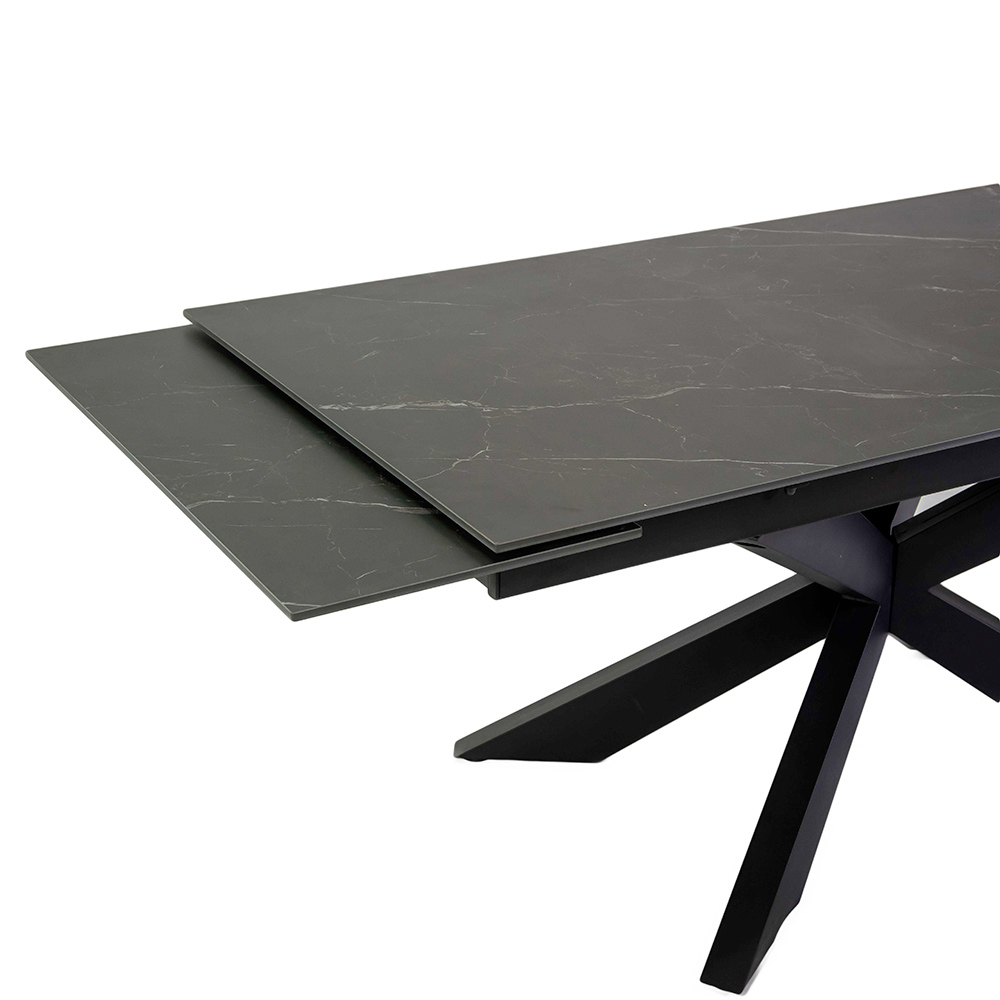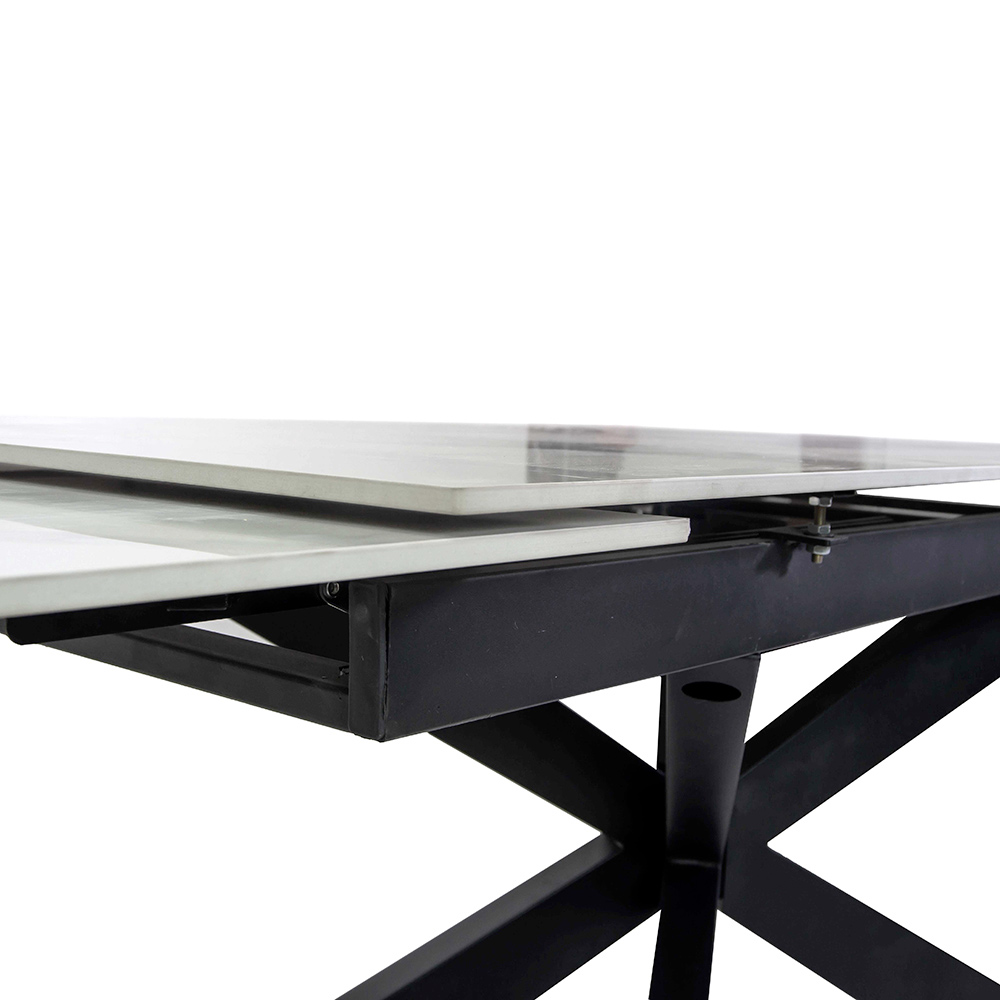 Dining table made with metal frame and synthesized stone top. The table is extendable with double lateral wing opening.