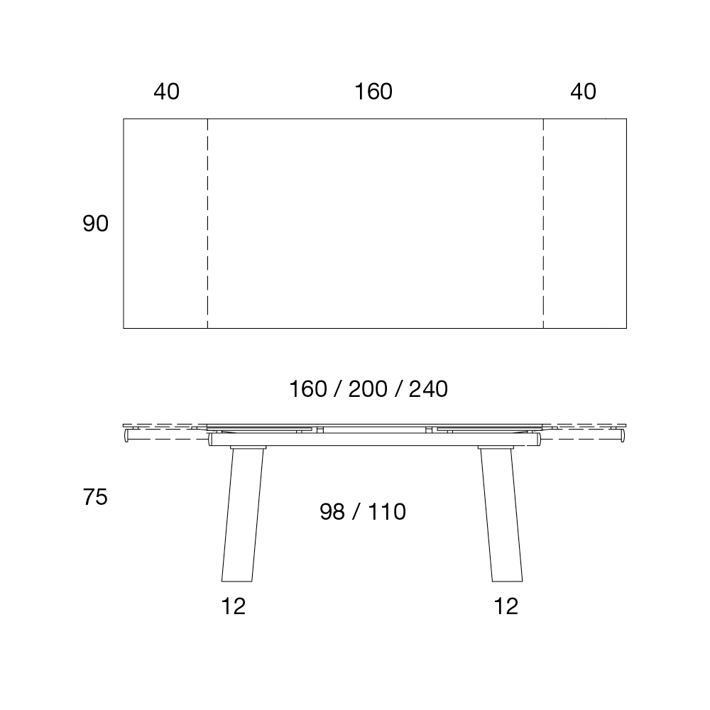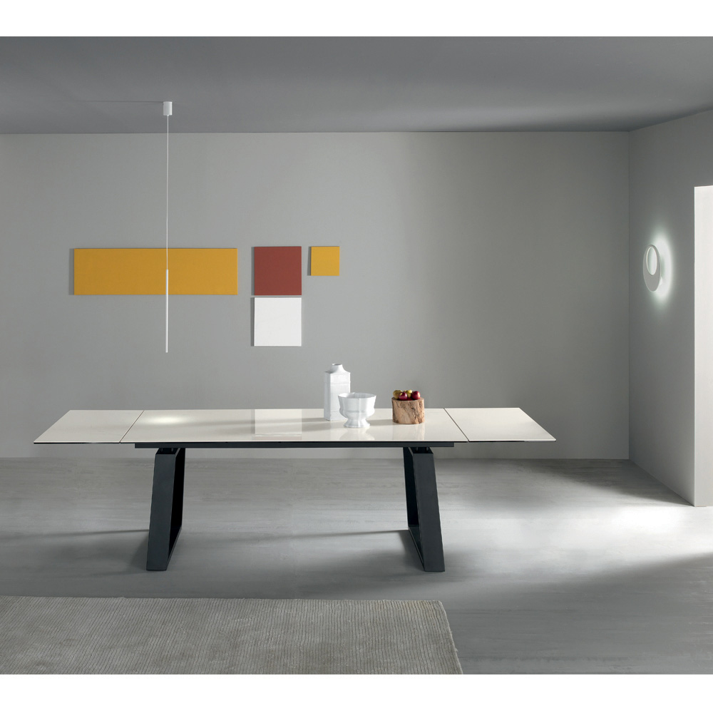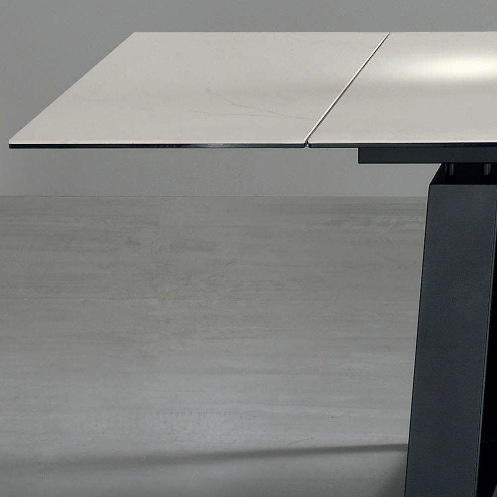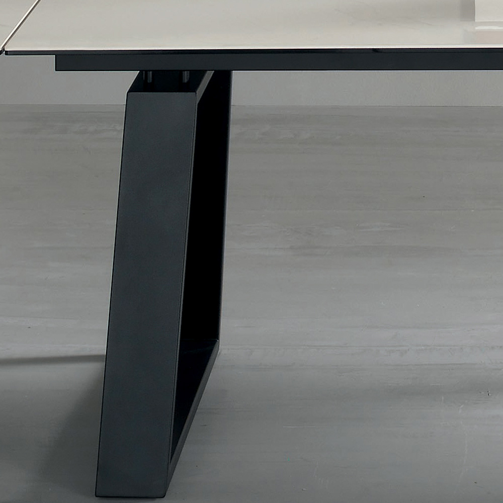 This extendable dining table has a structure with trapezoidal legs in black powder coated metal embossed and a polished ceramicfloor with 2 extensions on glass and aluminum frame. Its peculiarity is given by the structure with two fixed ground support elements and a design that highlights the contrast between the base and the top, especially in the finishes. The final effect makes the ceramic top seem like floating above the sturdy metal base, giving an ethereal and elegant atmosphere.
