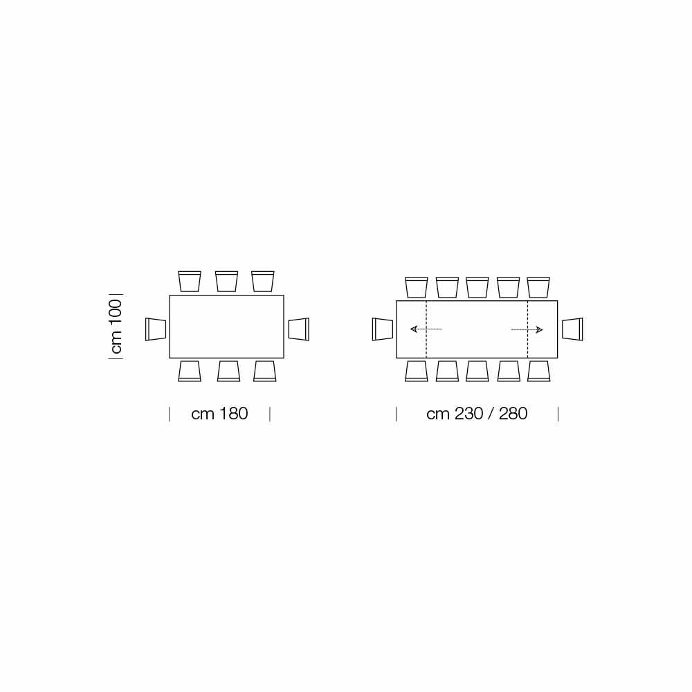 L 180 (280) x D 100 x H 75.8 cm 12-seater extendable with 2 external 50 cm extensions;