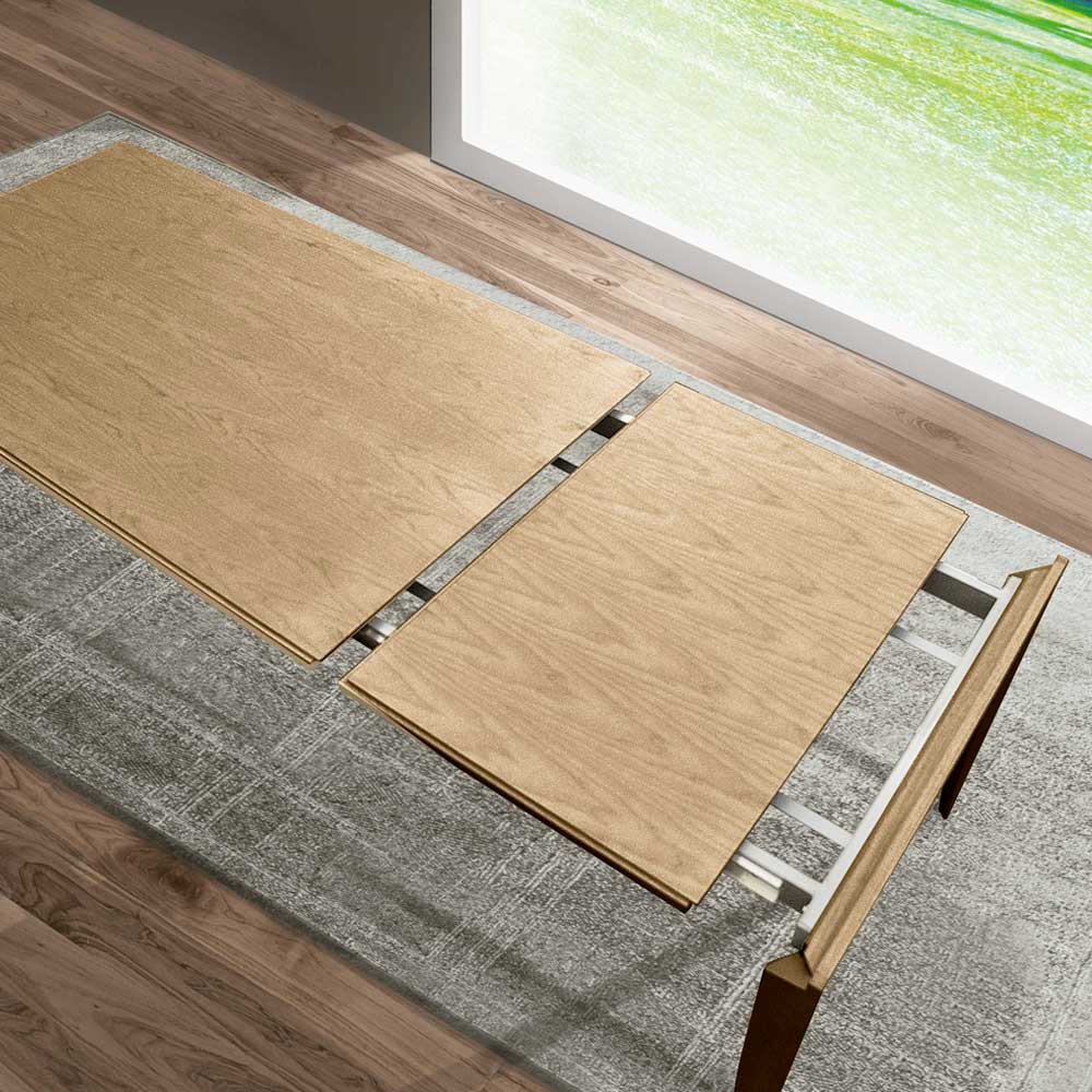This extendable table epitomizes essential design , combining functionality and contemporary elegance . Crafted from wood , it highlights the natural beauty of the grain , making each piece unique and authentic. The slim lines and clean geometric shape fit perfectly into modern spaces, while the extendable structure allows for easy transition from everyday use to larger gatherings, without sacrificing style. The tapered top and legs lend visual lightness and stability, transforming this table into a true focal point of the living or dining room. A perfect balance of Made in Italy refinement , versatility , and timeless design .