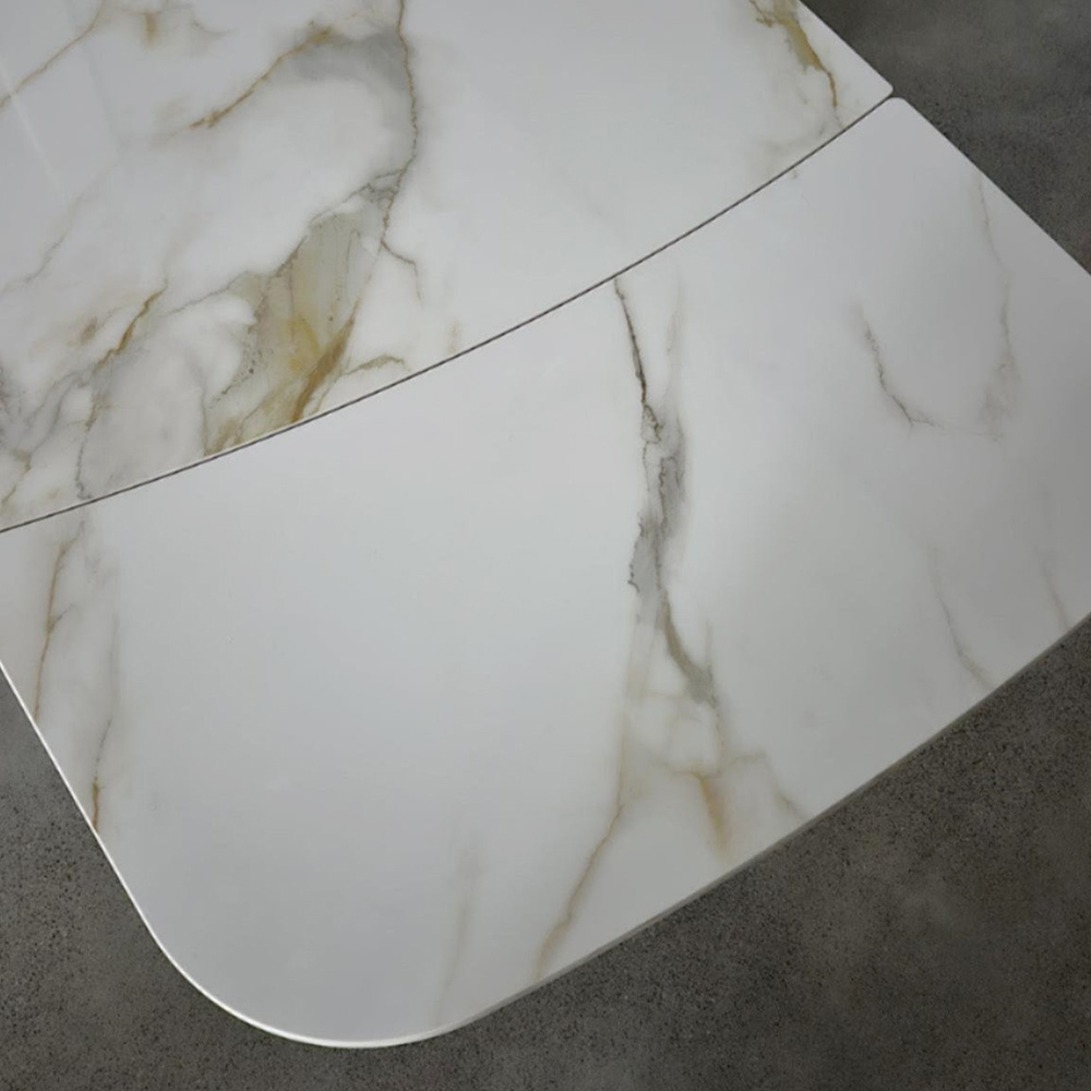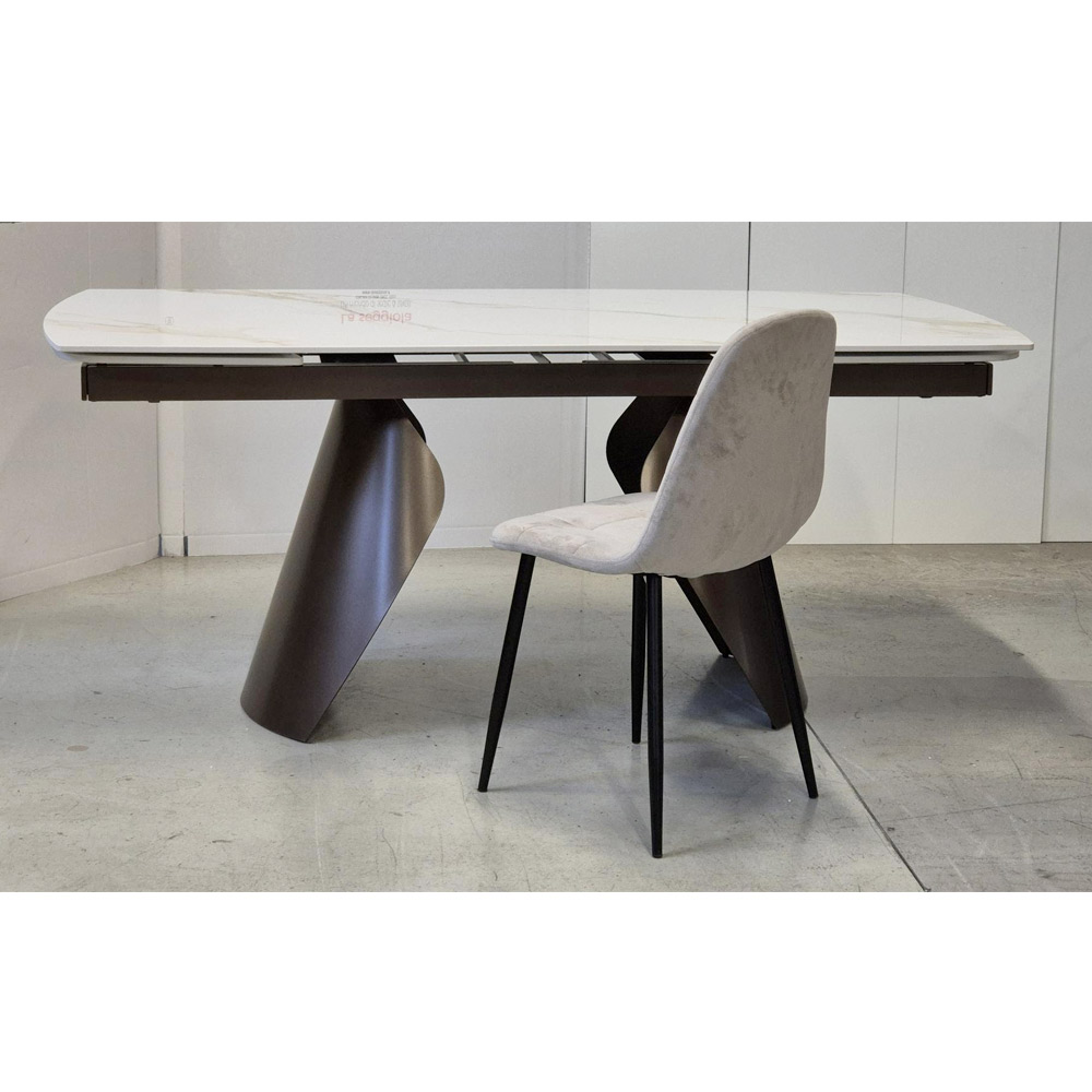 This stoneware and metal table is a perfect example of contemporary design that combines style and functionality . The elegant and luminous marble-effect stoneware top enhances the space with its golden veins and glossy finish that captures the light with natural refinement. The painted metal frame , with its asymmetrical sculptural legs , gives the table dynamism and character, creating a harmonious contrast between the solidity of the base and the visual lightness of the top.