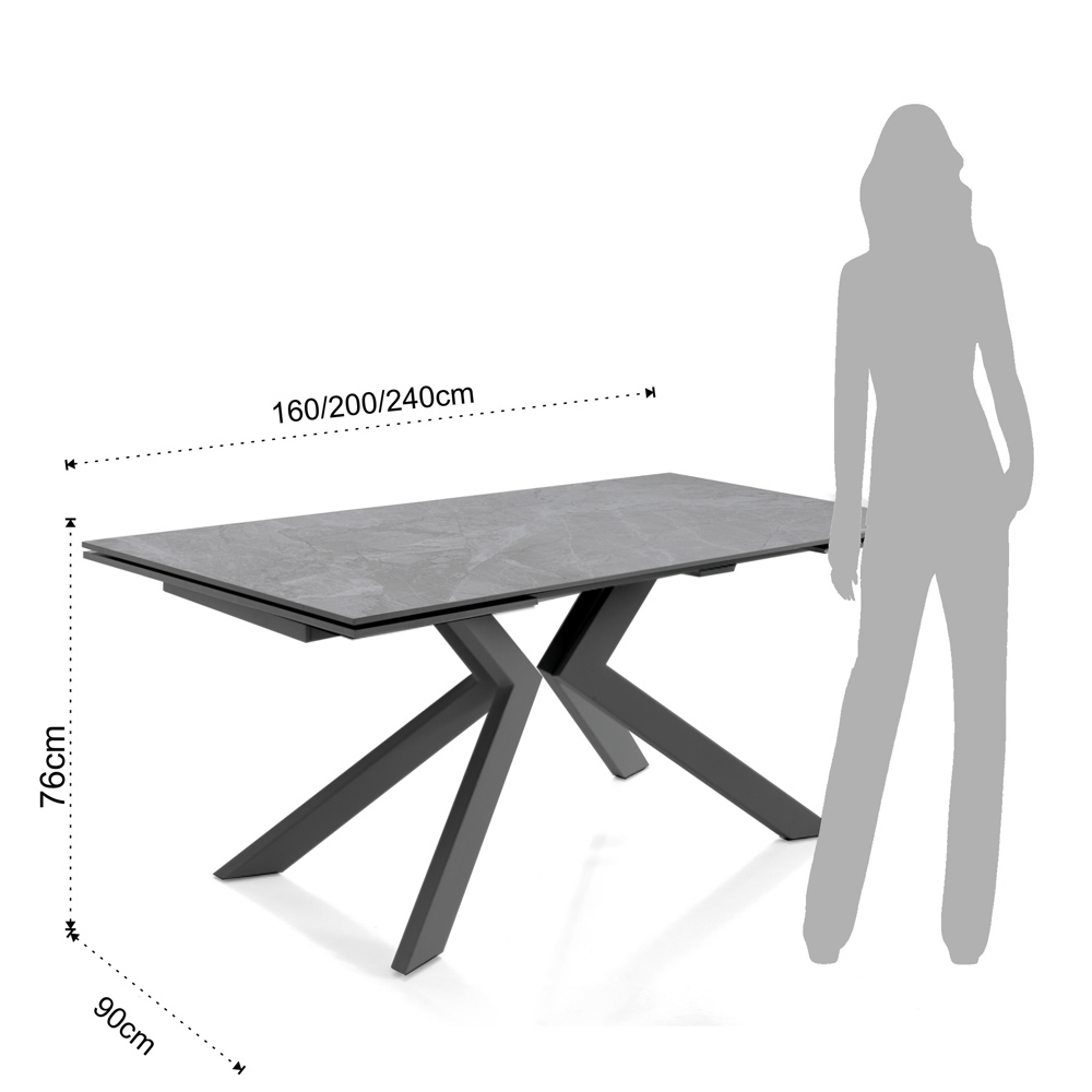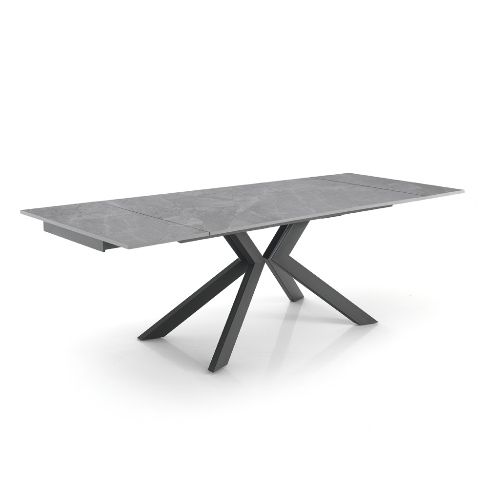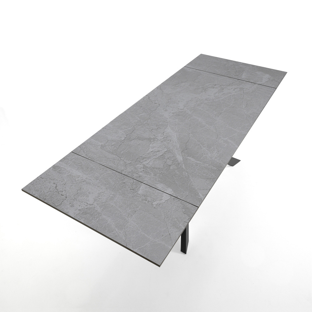 Extendable indoor table with ceramic top in matt gray marble finish th. 12 mm and base made of matt gray painted metal.