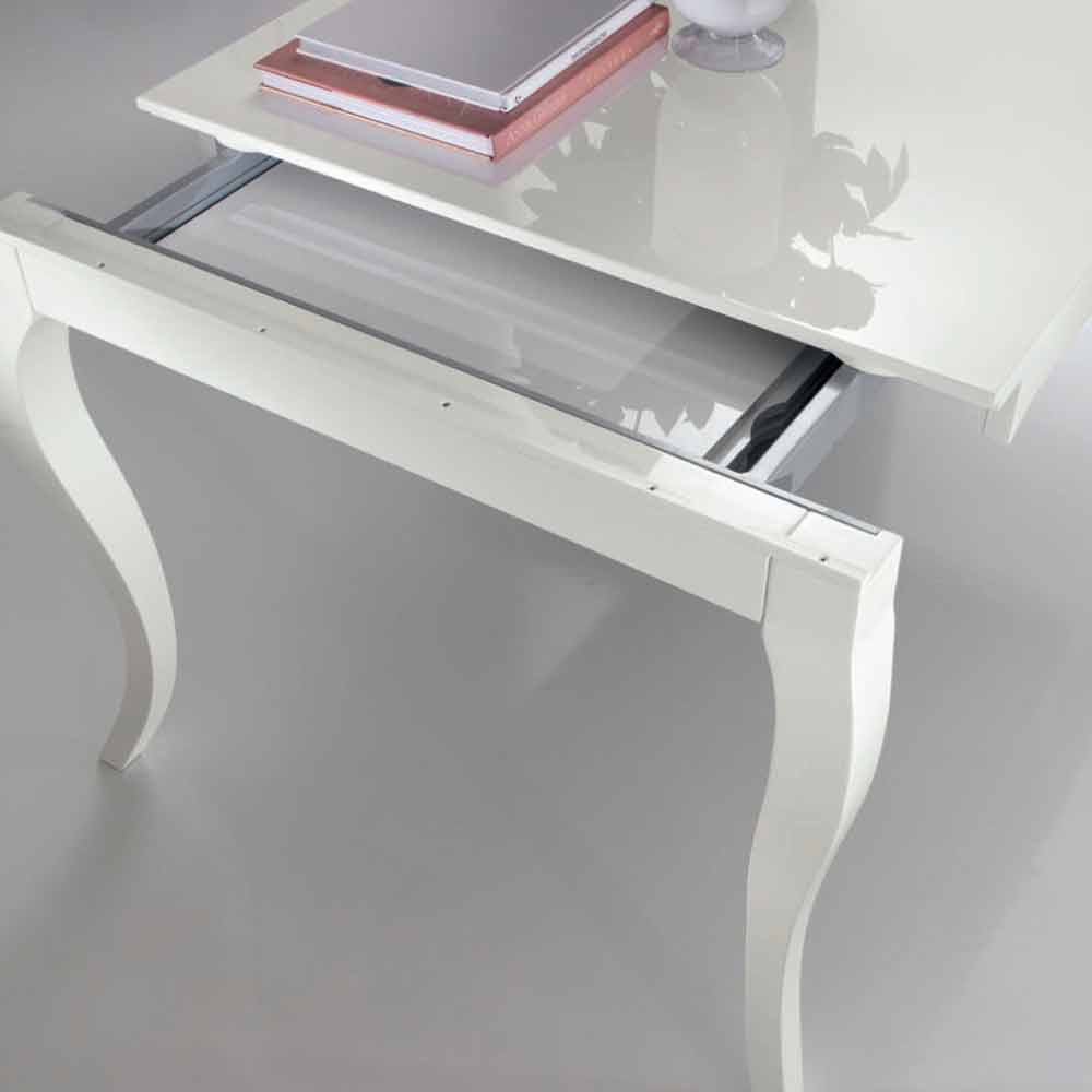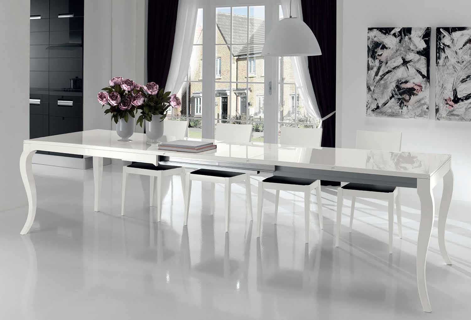 Extendable dining table up to 350 cm with glossy white Tanganyika walnut veneered wood top and solid beech wood base, made in Italy.