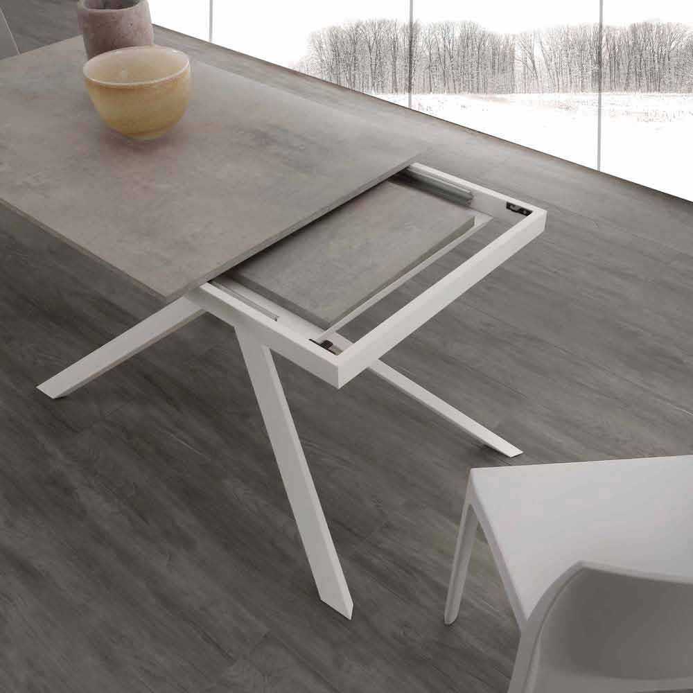 Lecce is made with a painted metal base available in two different colors and a melamine top available in three different colors: Metal base: - White; - Black. Melamine wood top: - Classic concrete; - Oxide cement; The extension is included in the table structure.