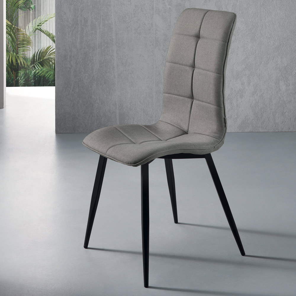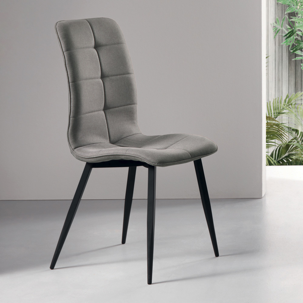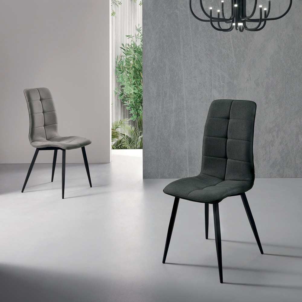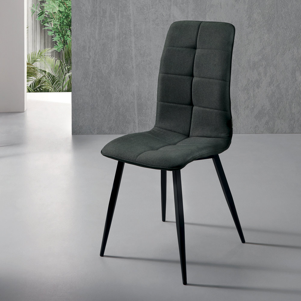 Dining room chair made of fabric with black painted metal structure. Characterized by the stitched backrest that gives originality, with a modern and linear design , this piece of furniture with an elegant soul has a wide and high backrest which ensures a soft and welcoming seat and optimal comfort . Every single chair combines style, quality, design and elegance. Thanks to its sinuous, simple and stylized lines, it is suitable for any type of furniture.
