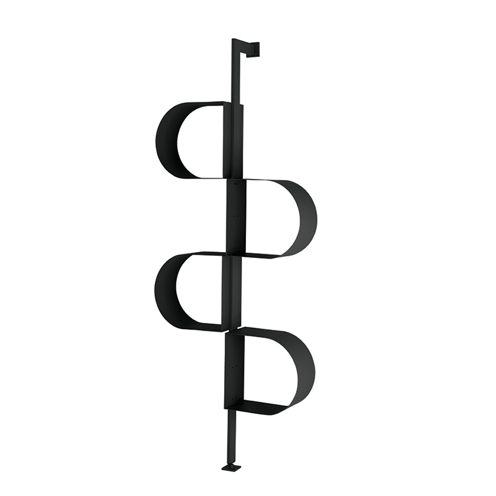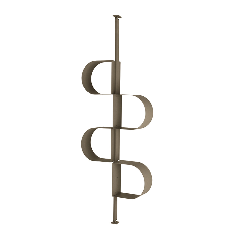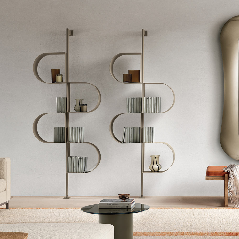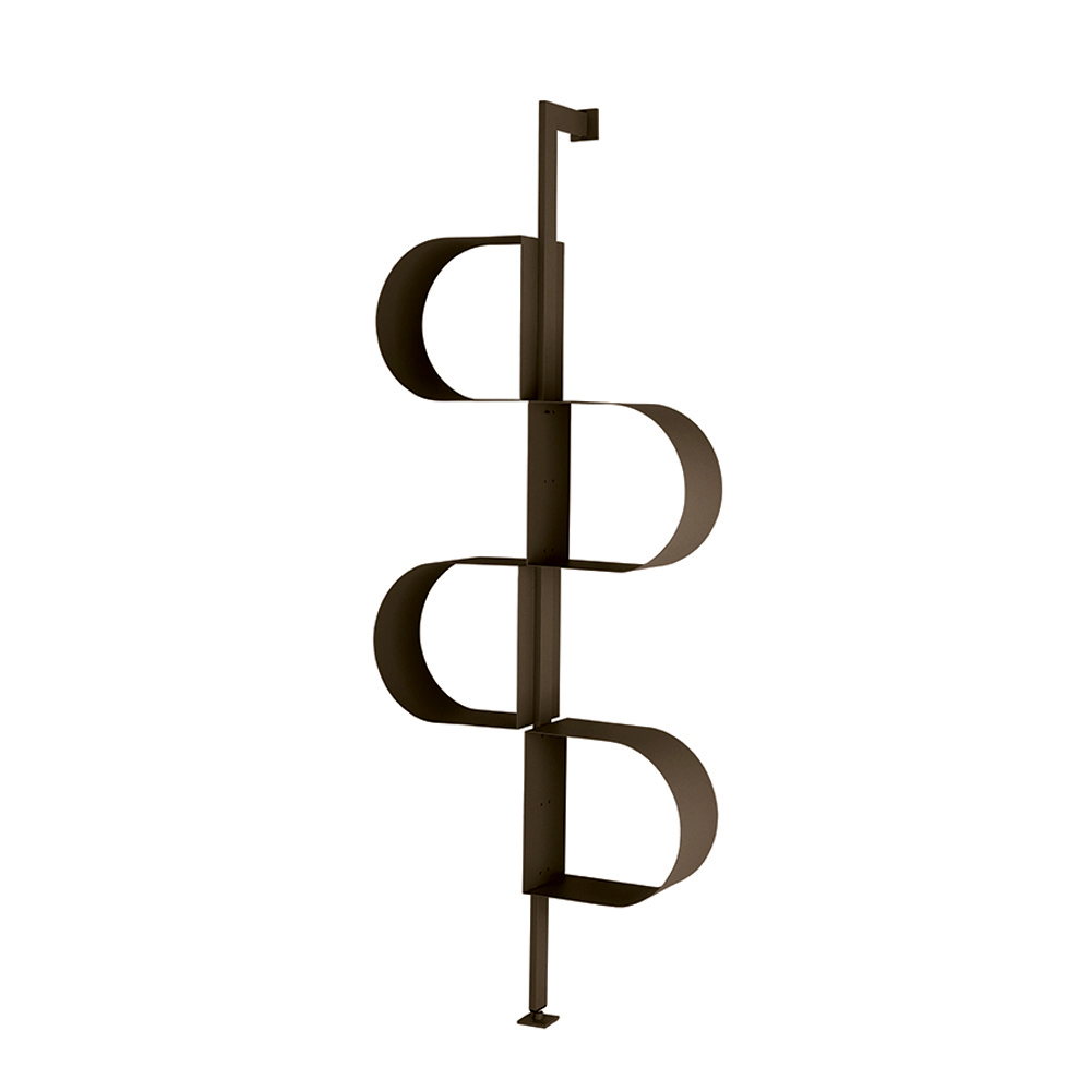 Made of painted metal , the bookcase develops vertically with a structure that recalls a continuous ribbon , creating a rhythmic sequence of storage compartments . This particular design allows you to organize books and decorative objects in an original and harmonious way.