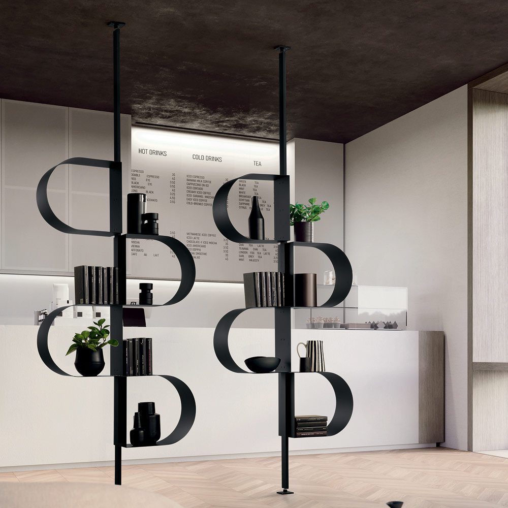 Versatile and functional, the bookcase is available with wall or ceiling mounting . The ceiling-mounted version can also be used as a room divider , creating subtle separations without weighing down the space.