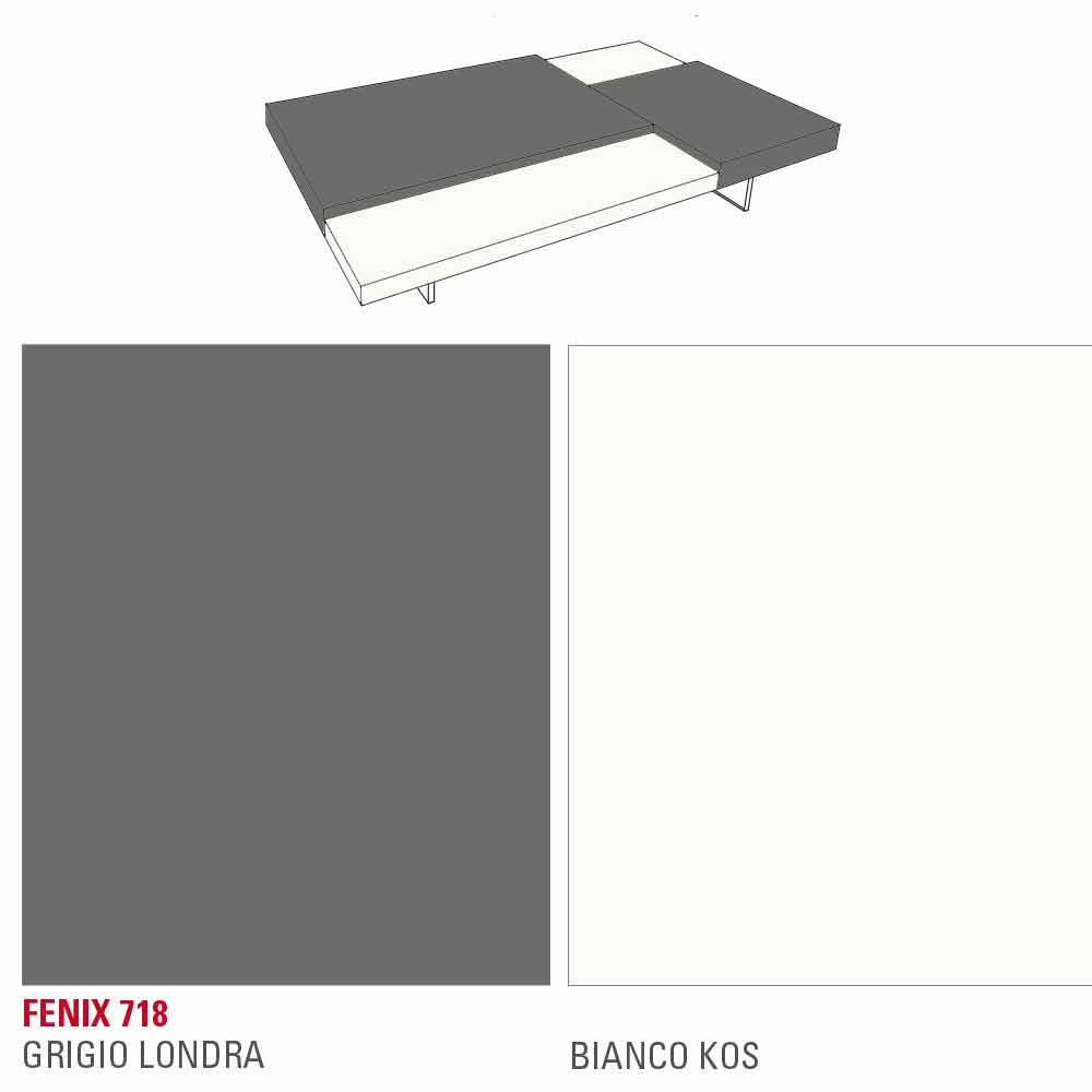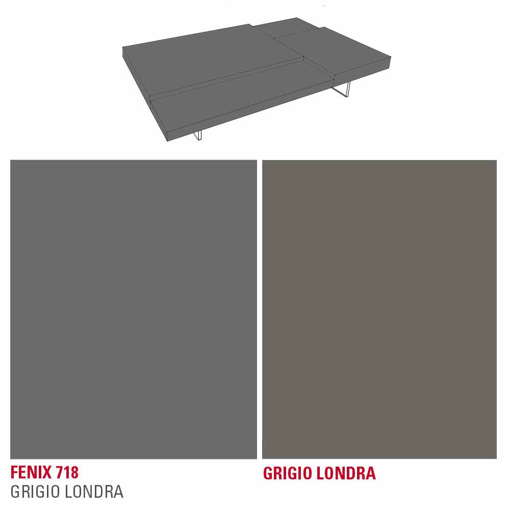 Coffee table with hpl tops and fenix covered tops supported by a melamine panel and transparent polymethylmethacrylate feet. In any living room, the presence of a coffee table is essential which, in addition to representing a practical and functional support surface, gives harmony to the furniture and completes its aesthetics thanks to captivating and original lines and shapes. This piece of furniture embodies all the fundamental characteristics of a perfect coffee table, proving to be an excellent idea for those who love to decorate their spaces with elements with a simple but impactful style. The particular shape of the tops placed at different heights plays an important role in the design of the product as it offers an exclusive play of contrasts. Furthermore, the 100% Made in Italy workmanship and the use of raw materials such as fenix lead to the creation of a particularly resistant product, pleasant to the touch and extremely opaque .
