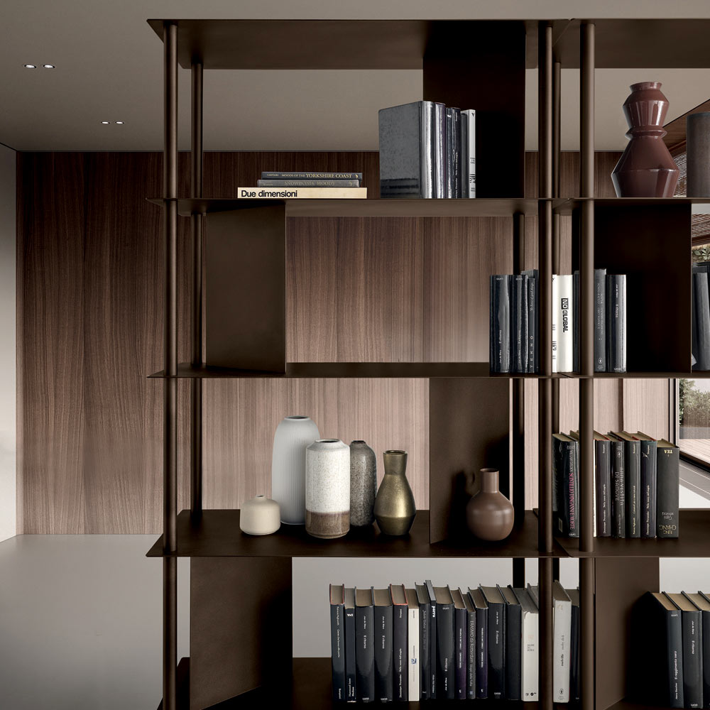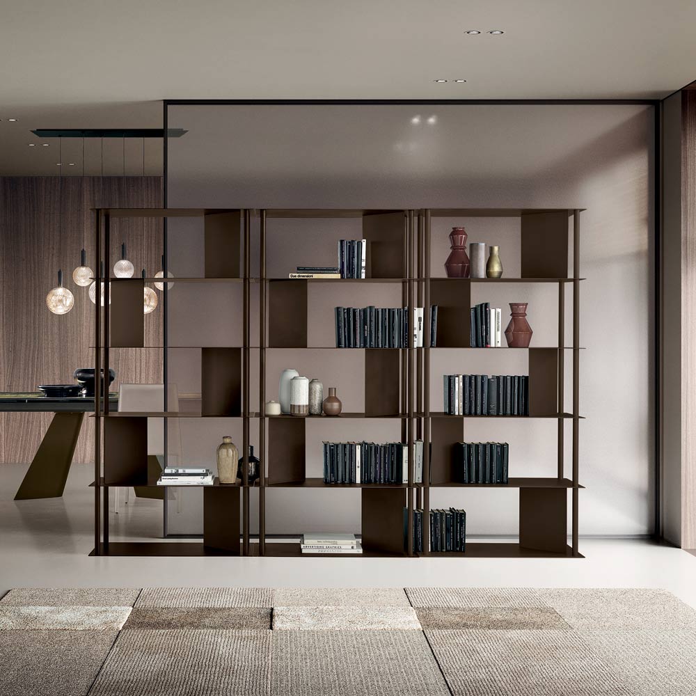 An elegant, Made in Italy designer bookcase , ideal for stylishly furnishing the living room , study , or passageways. Its contemporary design stands out for its lightweight yet architectural structure, enhancing any space with balance and personality.