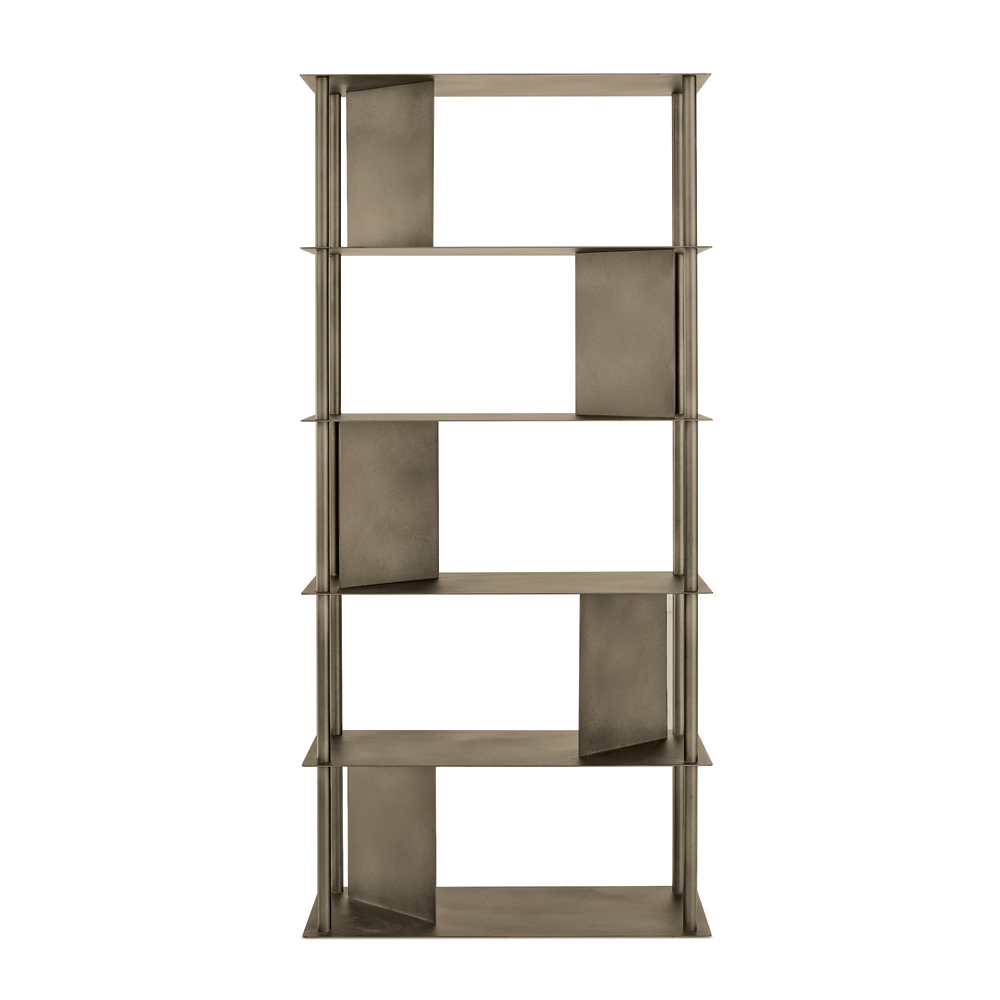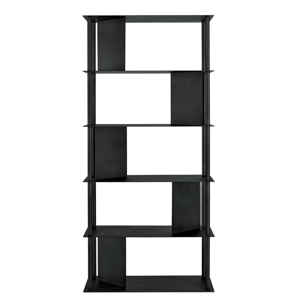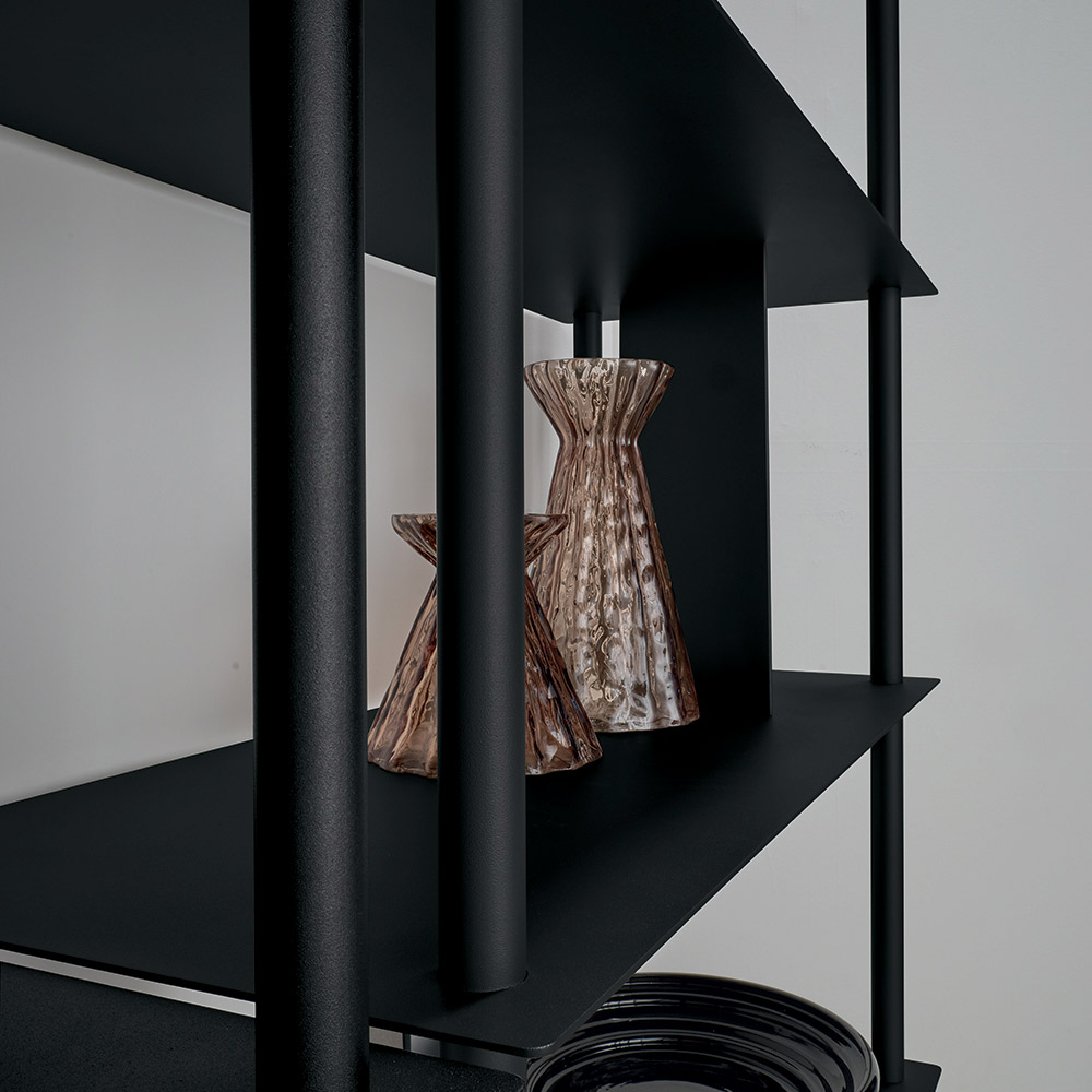 Crafted from painted metal , the bookcase is composed of four vertical perimeter tubes that support the shelves, interspersed with inclined plates that define the space and serve as supports for books and objects. This configuration creates a refined interplay of solids and voids, lending dynamism and depth to the composition.