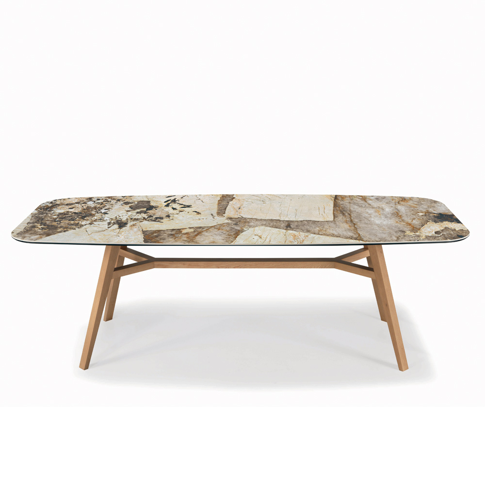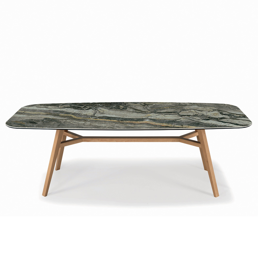 Fixed barrel-shaped living room table with ceramic top, 45° bevelled edge, ash wood base with Canaletto walnut finish . This product with a modern style has the primary objective of being able to be used daily without sacrificing design. The product chain, from conception to production, up to quality control, is carried out entirely in Italy , in order to guarantee and preserve the typical characteristic of Italian "know-how" and the importance of typical Made in Italy.