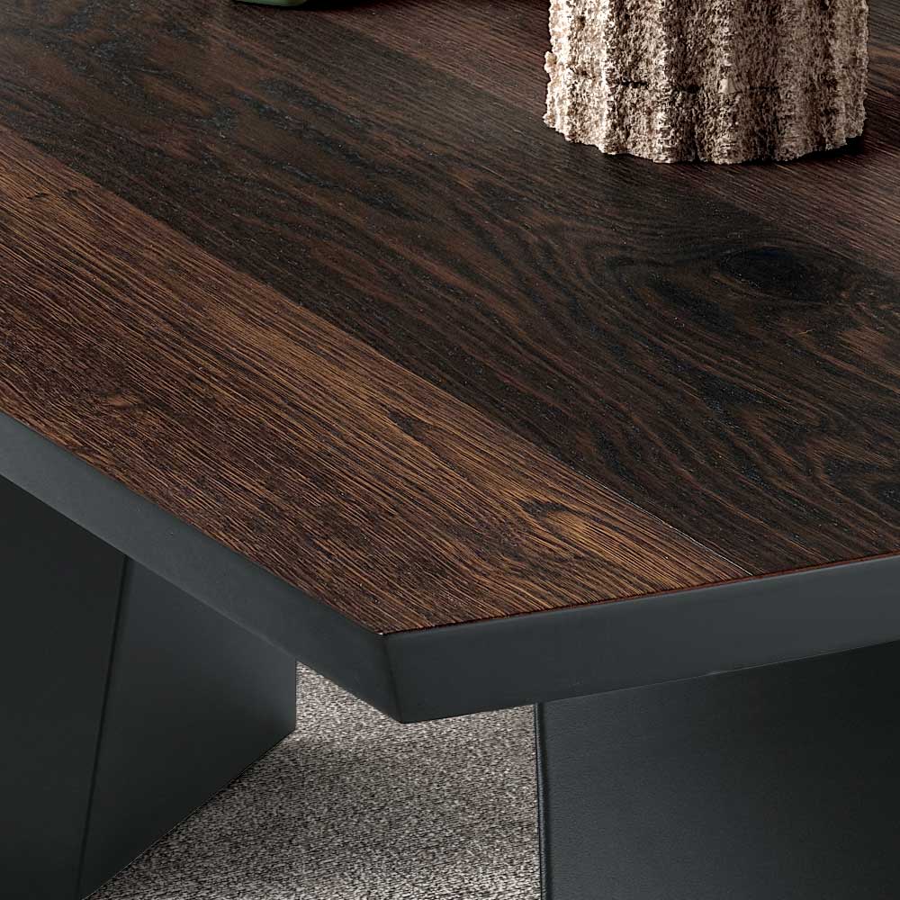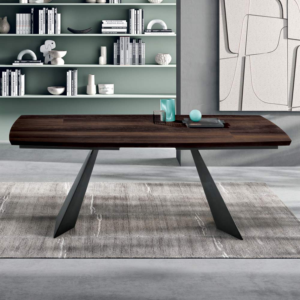 The combination of metal and wood creates an elegant and contemporary contrast, making the table suitable for a variety of furnishing styles. The top is available in raw oak and thermal oak finishes, designed to enhance the natural beauty of the wood and easily integrate into modern environments.