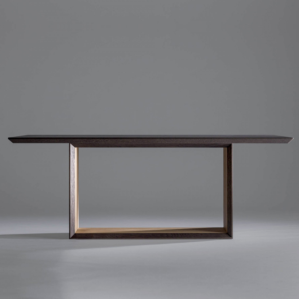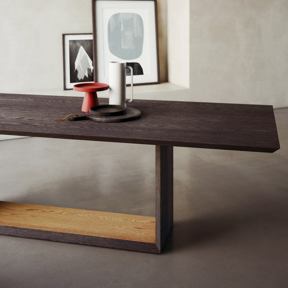 Fixed table with bevelled top veneered on smoke-coloured oak poplar chipboard.Beveled base intwo-tone veneer, exterior in smoked oak and interior in natural oak.