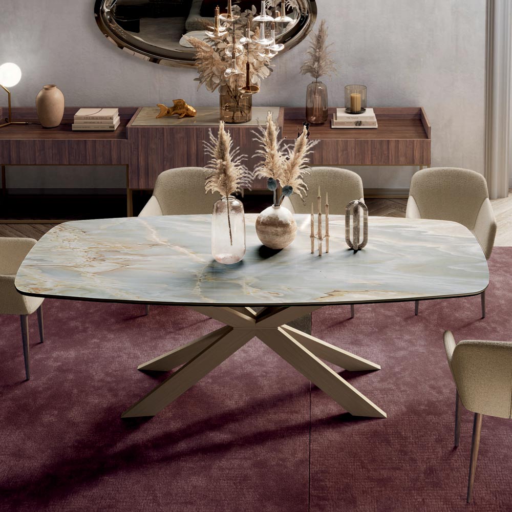 Fixed barrel-shaped living room table with ceramic top in shiny silver onyx finish,45° bevelled edge, champagne lacquered steel base with adjustable feet. All the mastery and quality of Italian artisans are contained in this product, where the best materials have been chosen and maximum attention has been paid to every single detail . We wanted to combine modern style with functionality to create a table that is not only beautiful to look at but also usable in different occasions.