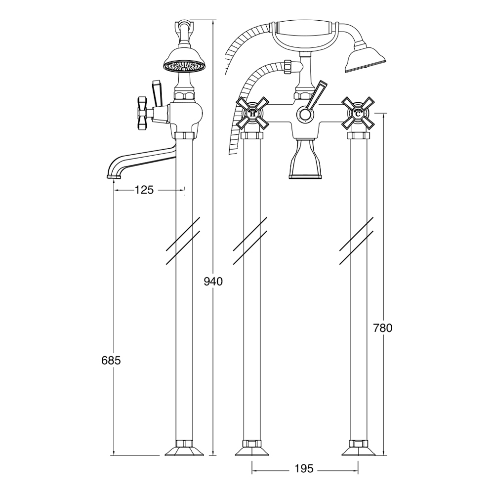 floor bathtub assembly with hand shower and flexible hose, made of brass.