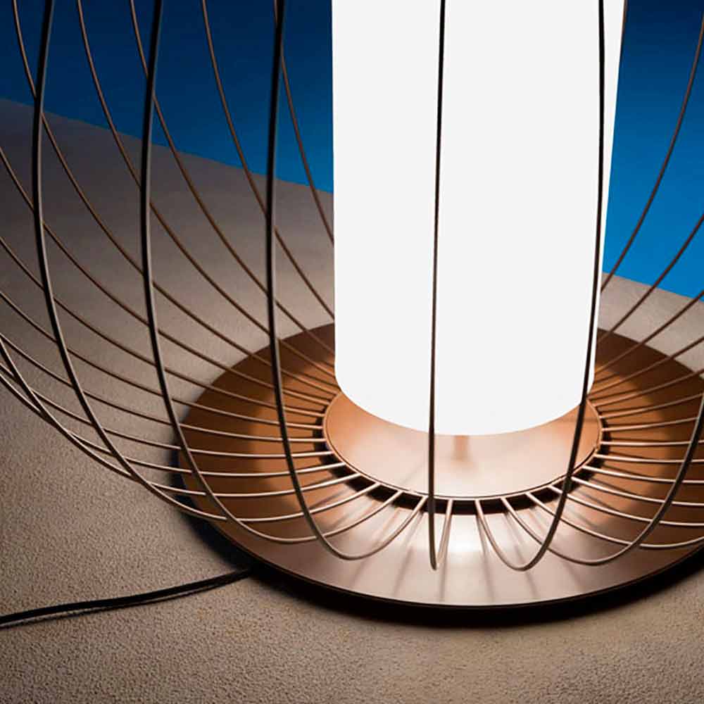 This original and singular table lamp has a design inspired by lanterns flying in the sky, re-proposing its structure and spirit thanks to its thin lines that defy the air made of metal wire, for a minimal complement with a strong character.
