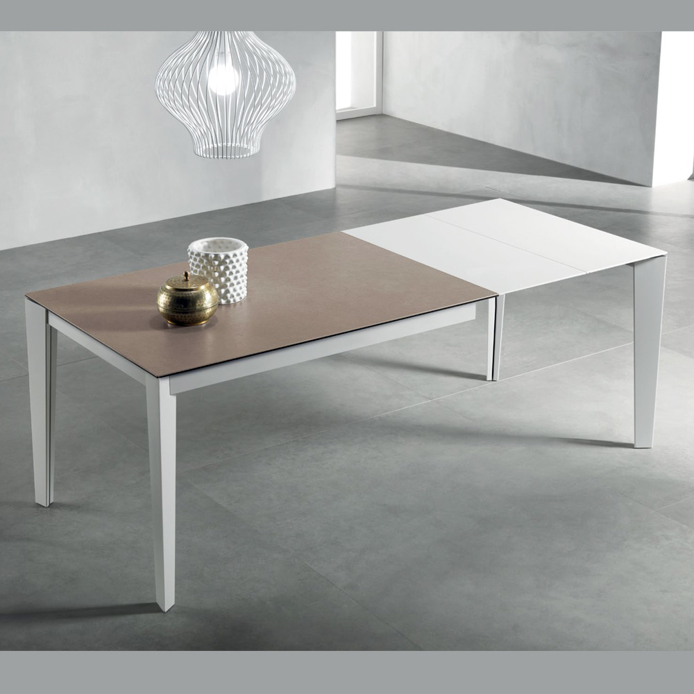 Elegant and functional, this extendable rectangular table combines modern design and practicality. Its 10/11 mm thick glass-ceramic top with a Fokos Terra finish , while the matte white painted metal legs add stability and a contemporary touch.