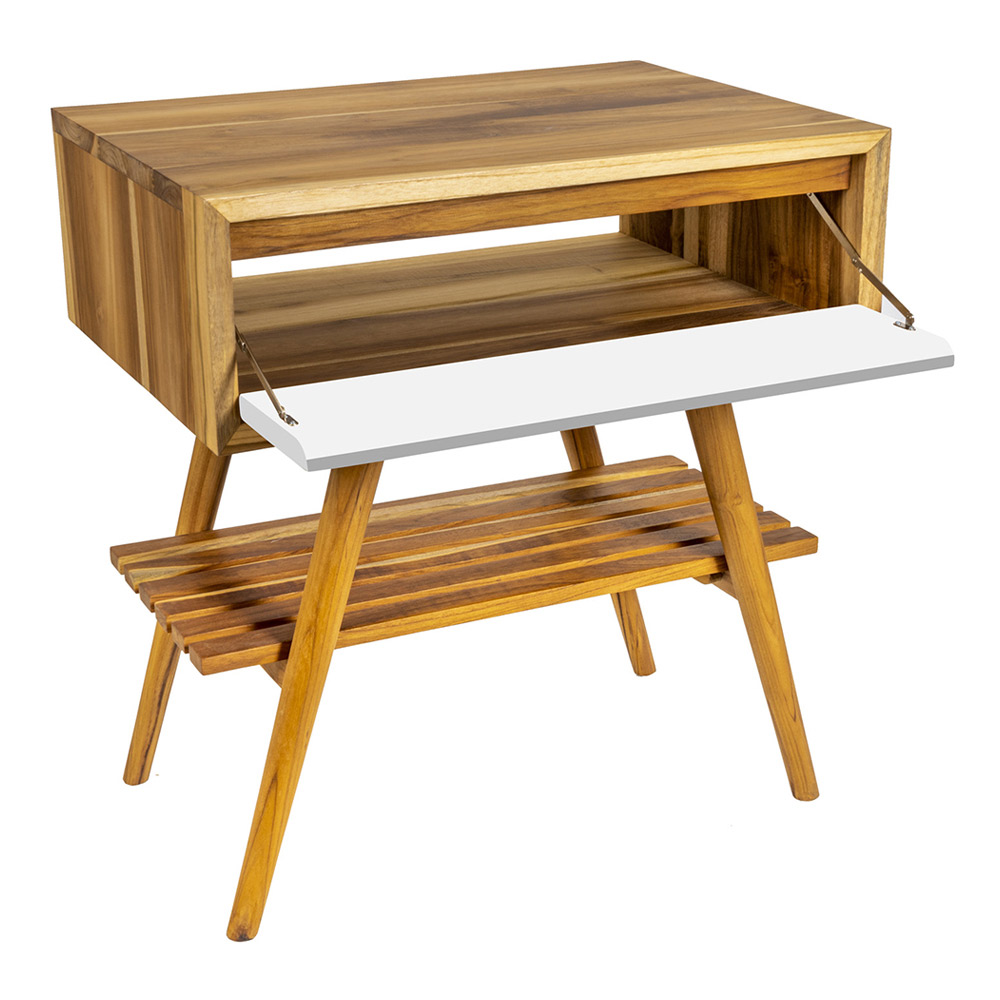 Floor-standing teak bathroom cabinet with white flap drawer.