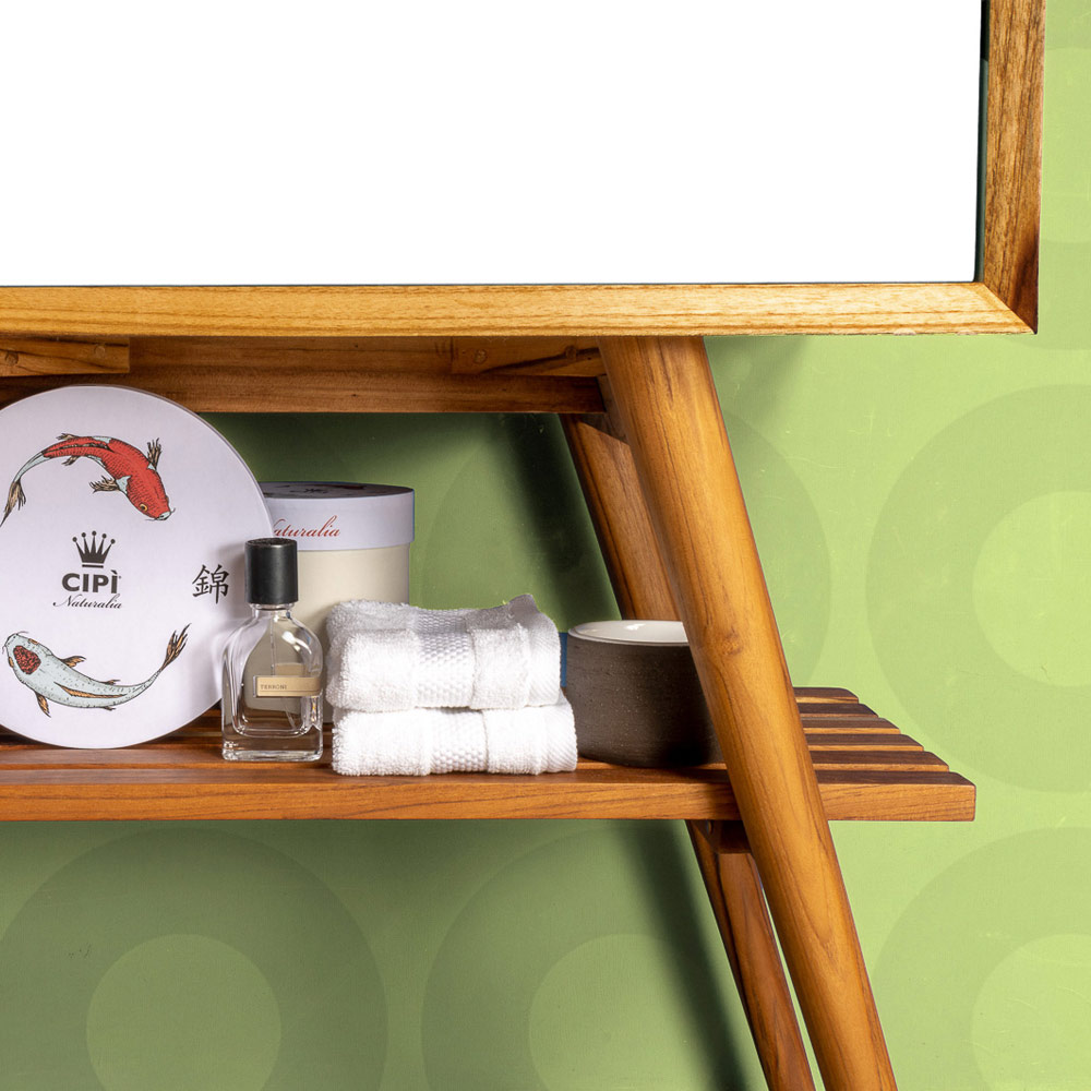Free -standing bathroomcabinet with recycled natural teak structure and flap drawer in whitemahogany wood , a color that represents the concept of peace, freedom, purification and a new beginning, bringing to mind the whiteness of snow and the brightness of nature in the its purest form. Its structure is characterized by simple shapes and practical spaces ideal for organizing the bathroom area in an elegant and functional way for an original result with a strong modern personality .