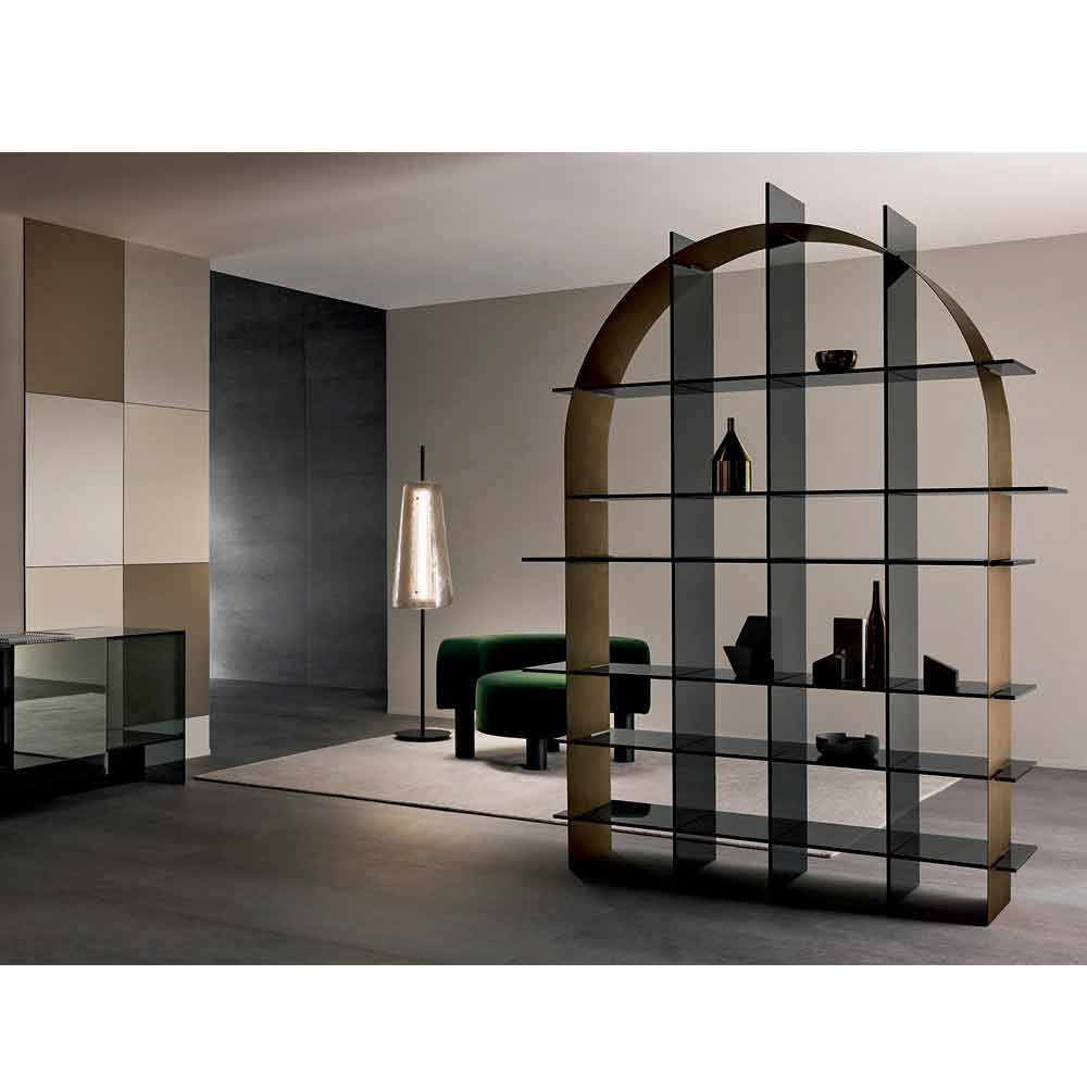 This bookcase for the living room is characterized by its unique and incredibly elegant design, made with sides and shelves entirely in smoked glass.