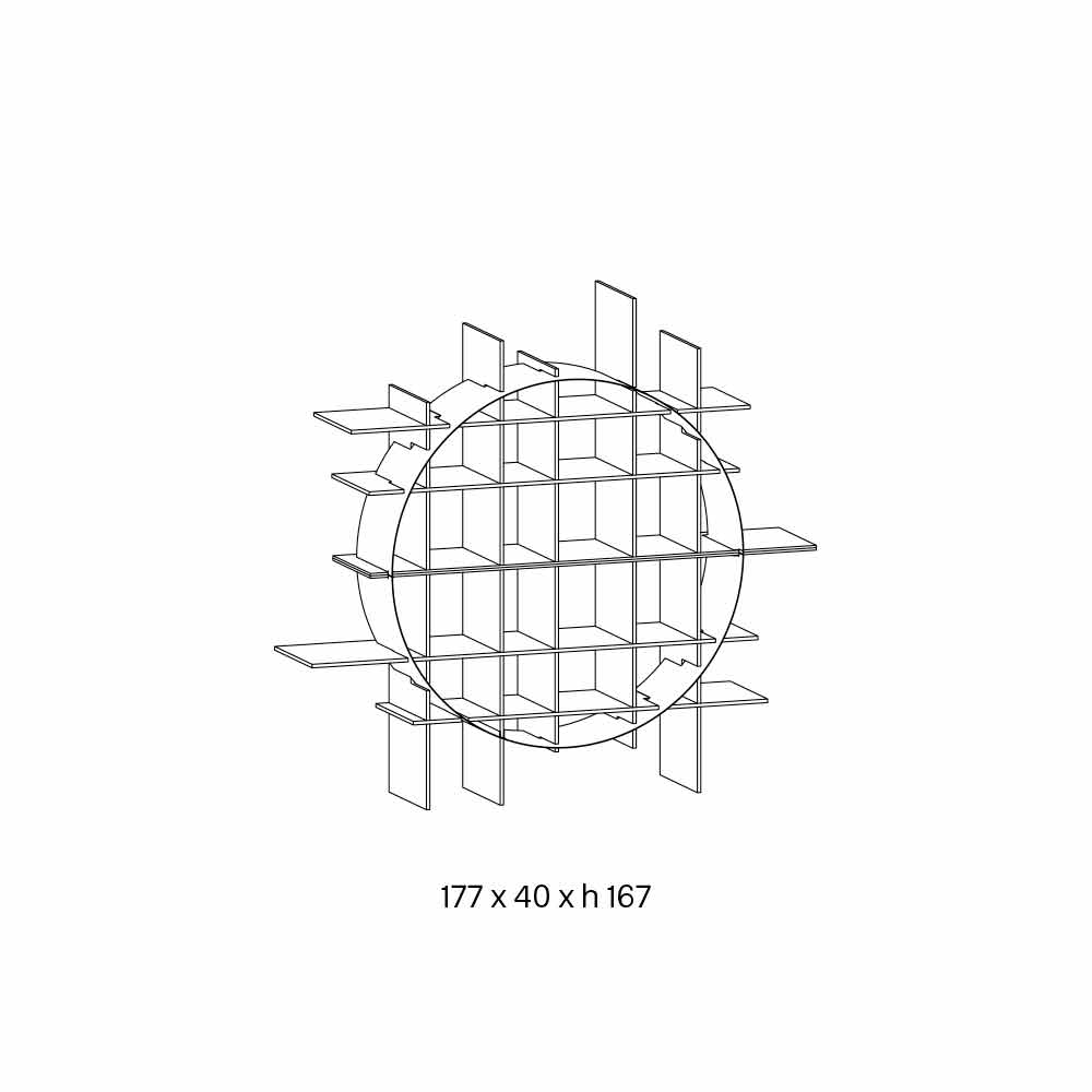 Its peculiarity consists in the interlocking structure made of thin sheet metal with a circular shape in a brushed black finish that integrates with the composition giving an effect of extreme refinement and geometry.