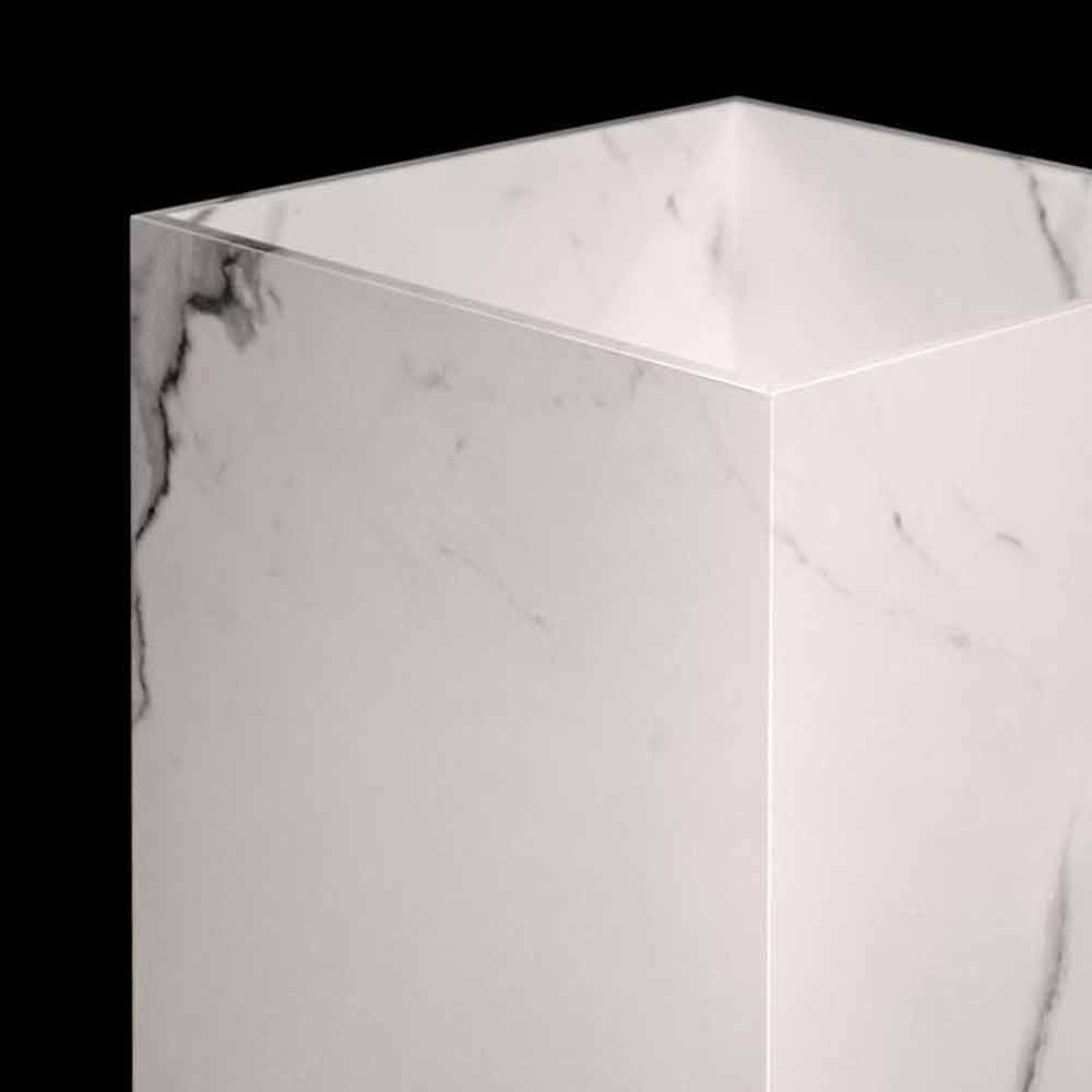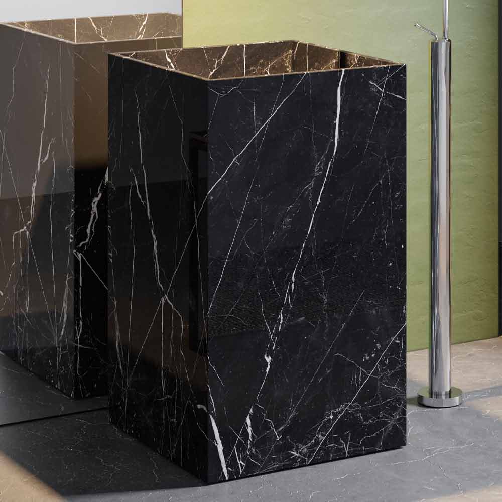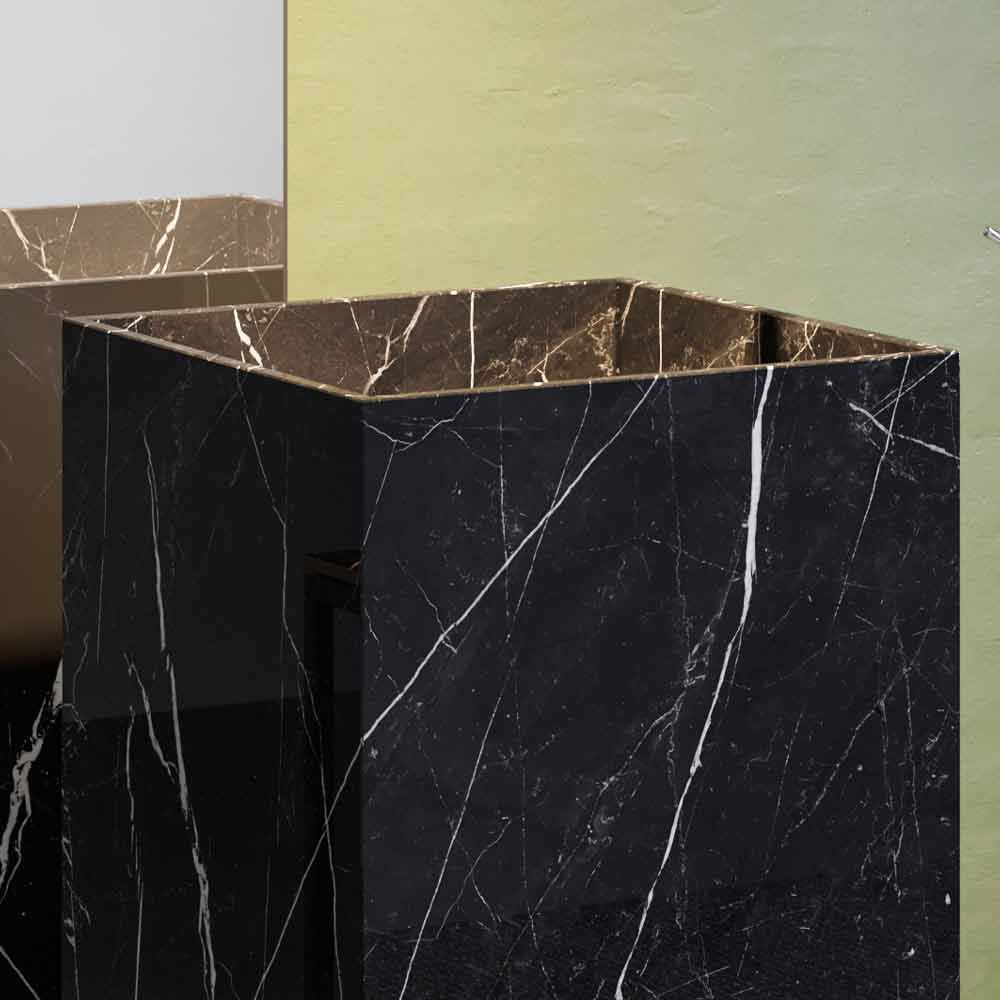 The monumental and timeless design of this pedestal washbasin made entirely of porcelain stoneware is able to become the protagonist of the bathroom area. The geometric and imposing parallelepiped shape creates sophisticated and luxurious atmospheres. It is equipped with a universal drain with ceramic up & down cap / free drain of 7.1 cm.