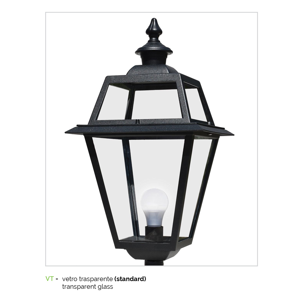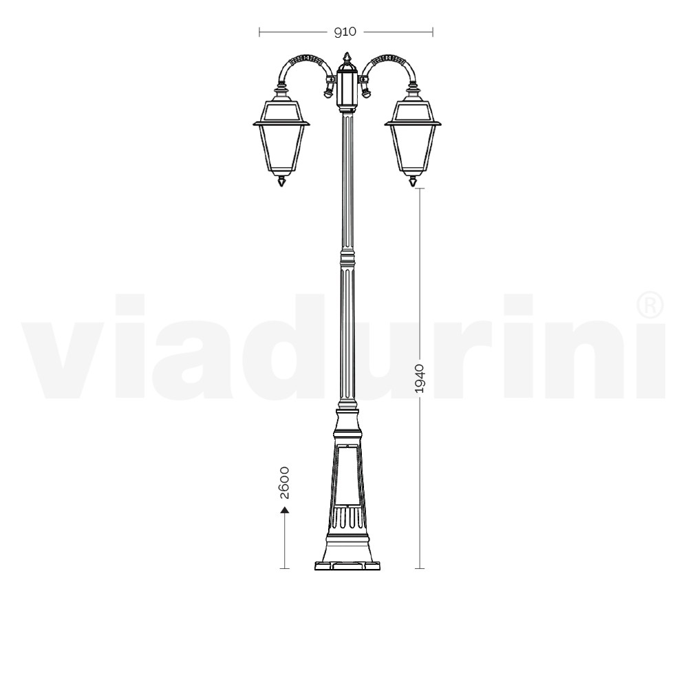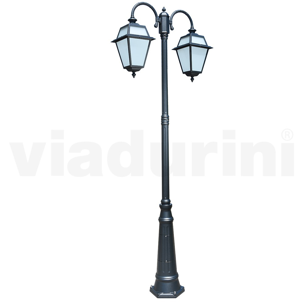 2-light street lamp entirely made in Italy with die-cast aluminum structure in anthracite gray finish and glass diffuser. Complete with stainless steel screws. A product with an exclusive and elegant aesthetic characterized by wonderful details and decorations with a romantic soul that enrich the simple design of the structure with a unique and refined touch. Ideal for outdoor environments such as gardens, courtyards, avenues and walkways but also contract spaces such as bars and restaurants.