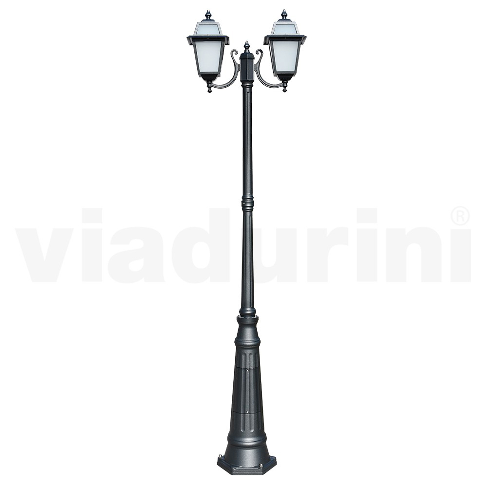 This cast aluminum street lamp with its anthracite finish is a stylish choice for any outdoor setting. With a classic and elegant design, it features crafted details that evoke an atmosphere of times gone by. The 2 lanterns, with attention to the smallest details, spread a warm and soft light, ideal for creating a luminous path in your garden or for classy delimiting an outdoor relaxation area. Solidity and beauty come together in this street lamp, designed to last over time and resist atmospheric agents. Elegant and functional , it will be the luminous signature of your outdoor space.