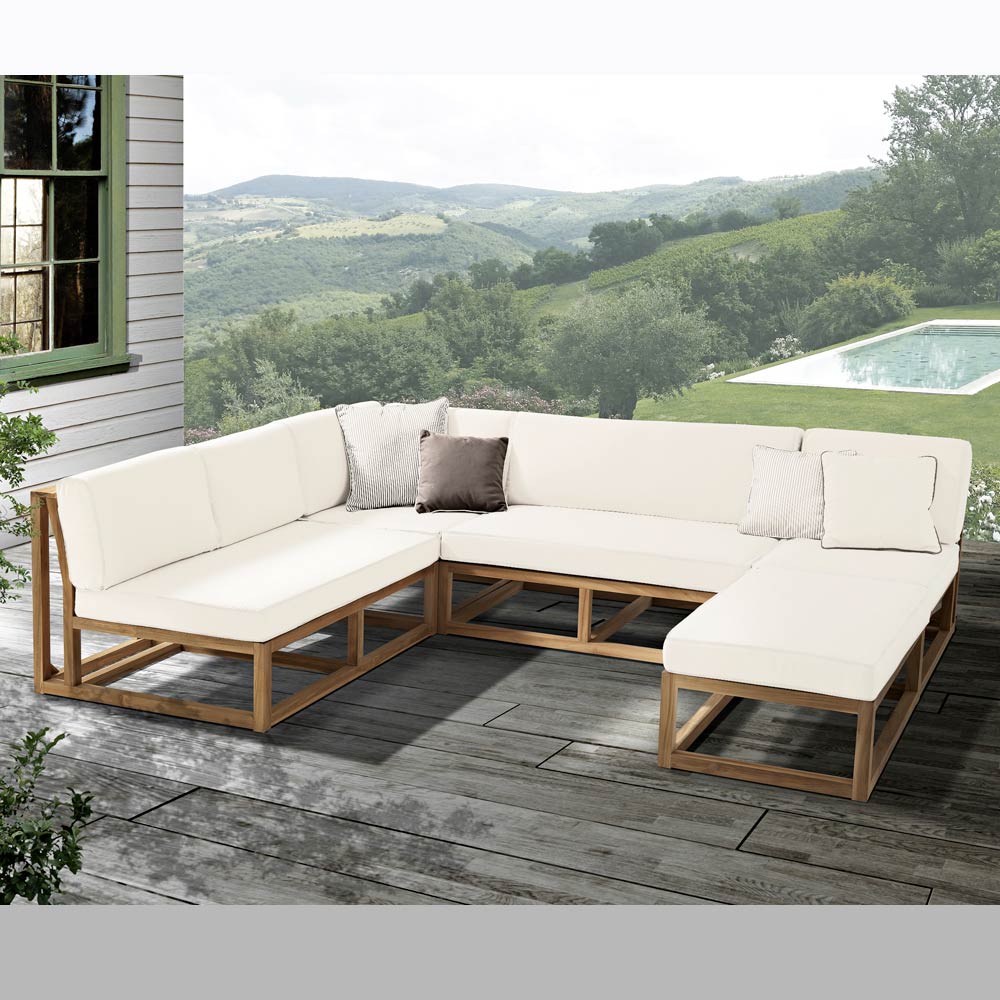 natural teak structure. Imagine yourself sitting in this modular garden lounge set that combines expert craftsmanship with contemporary design. Every element, from the natural teak frame to the clean, modern lines , has been designed to create your own personal haven. Teak wood, renowned for its strength and durability, ensures that this set will become a permanent feature of your outdoor space, aging gracefully and acquiring even more appeal over time.
