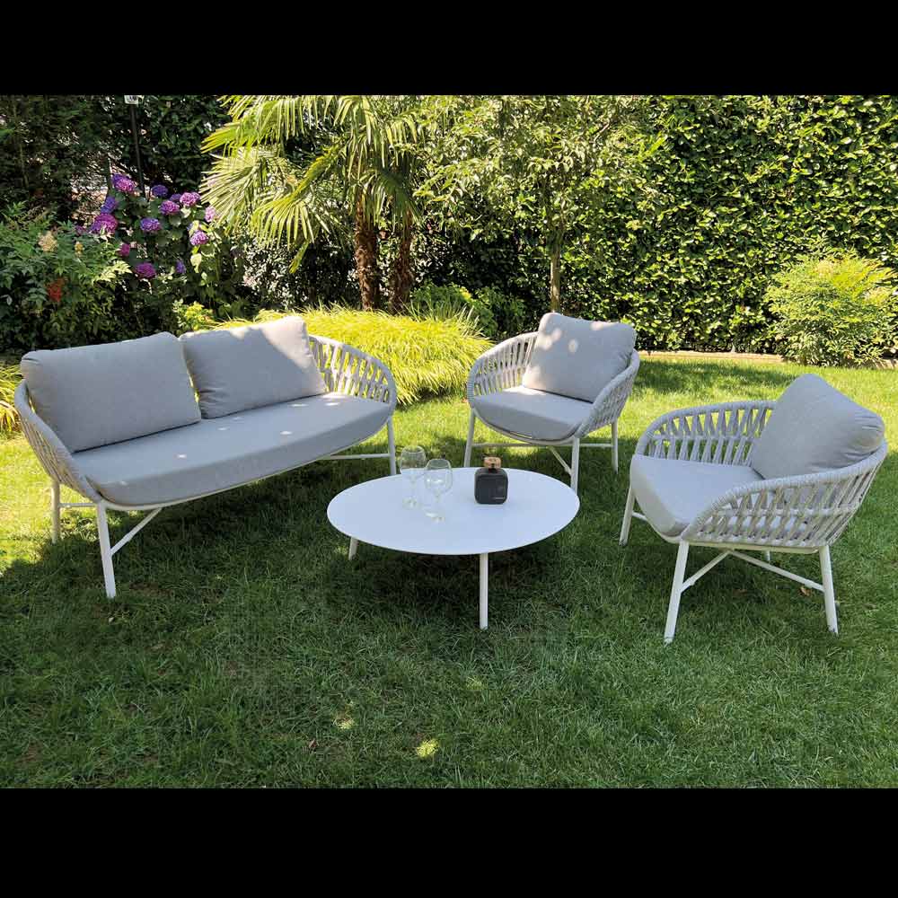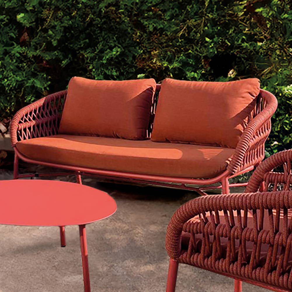 This garden sofa is a perfect example of welcoming design and artisanal refinement , ideal for creating a lounge corner dedicated to relaxation and style . The painted aluminum structure, light but resistant, elegantly supports a refined weave in polyester rope , which gives movement and personality to the seat.