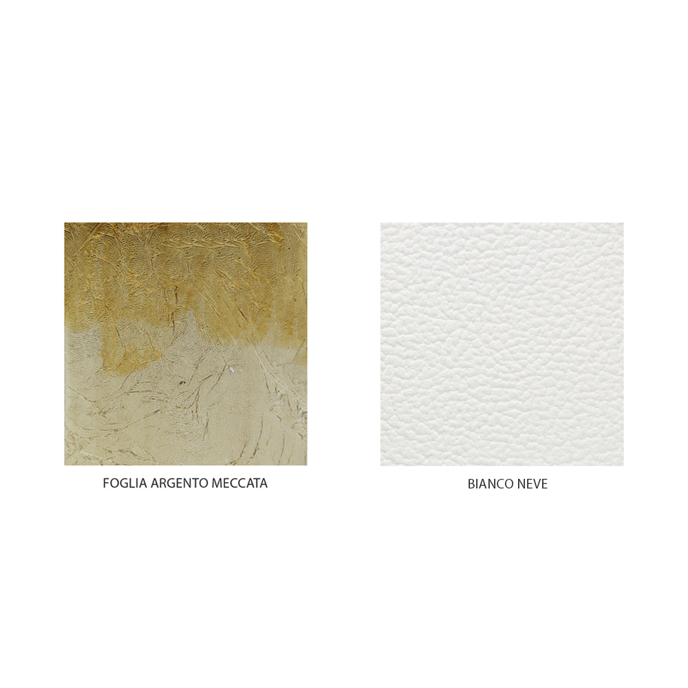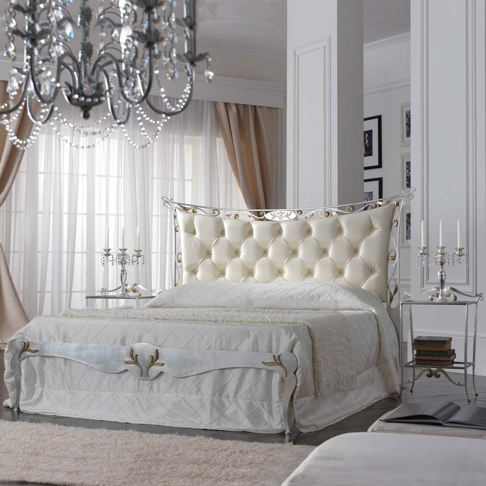 Double bed made with coordinated solid iron headboard and footboard in handcrafted leaf paint finish and real leather padding in snow white finish. 2 bedside tables made with solid iron structure in artisanal finish in meccata silver leaf or gold leaf and 2 glass tops. Also included are a TENCEL mattress with 980 pocket springs + 4cm of memory, removable cover and medical device and 2 memory pillows , complete with removable and washable TENCEL pillowcase