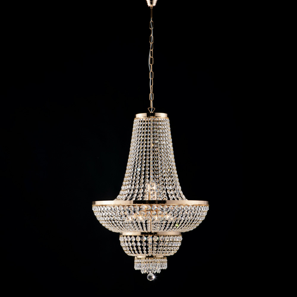 Dramatic, luminous, and highly prestigious, this classic luxury chandelier in iron and brass with rhinestones is designed for spaces that want to stand out with elegance. The slender structure, embellished with cascades of sparkling rhinestones , reflects the light, creating a refined play of reflections that enhances any space.