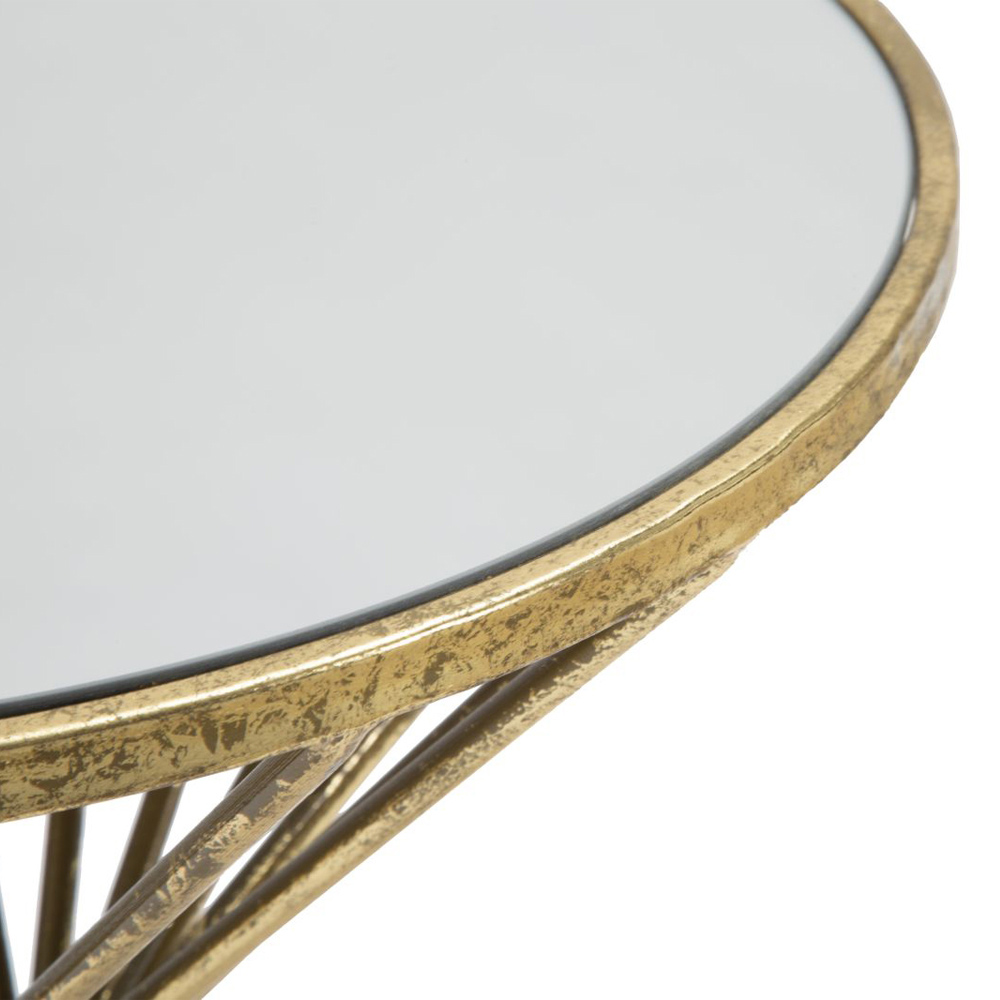 Coffee table with gold finish iron structure and round mirror top . A piece of furniture with a simple and versatile design designed to elegantly complete any living room for an exclusive and refined result . Its peculiarity is the marvelous conformation of the structure which develops in height through an hourglass shape and supports the round mirror top, emphasizing its sophisticated aesthetic .