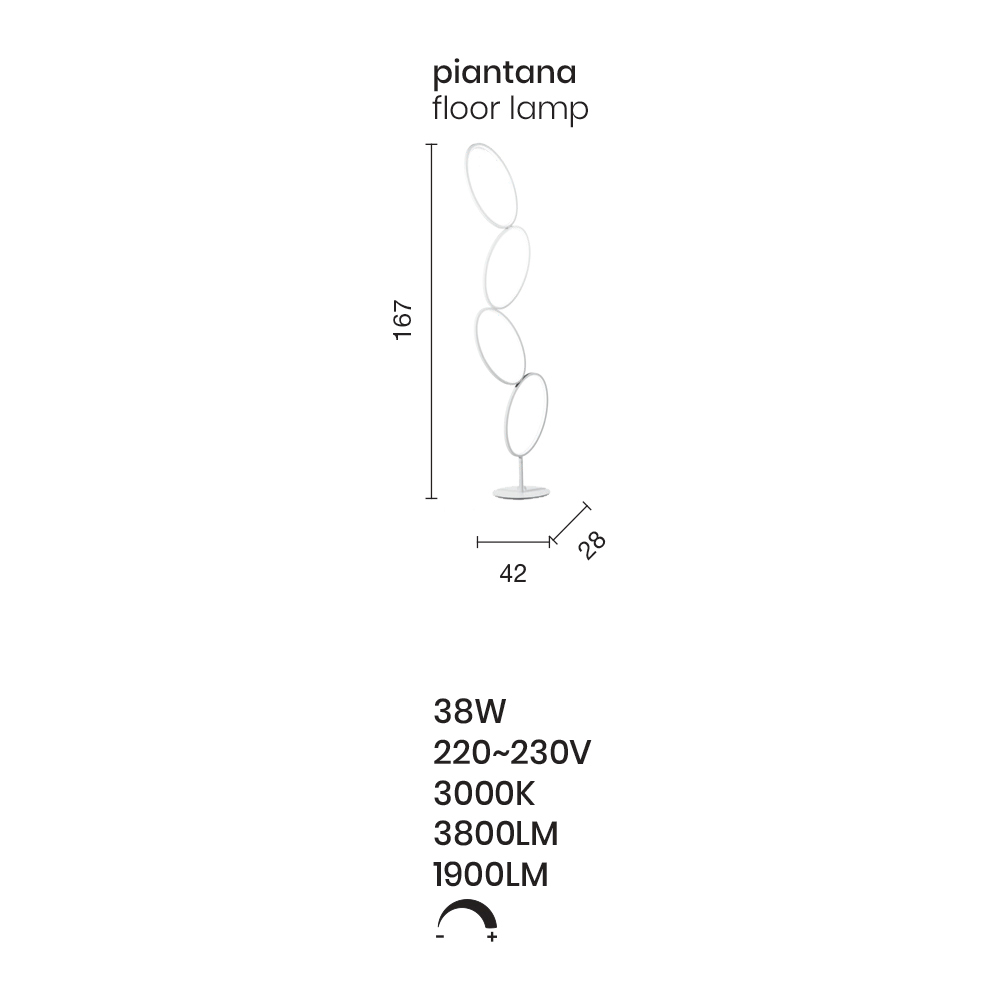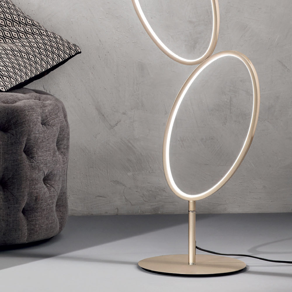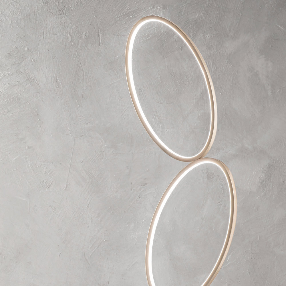 Modern floor lamp with gold metal structure and acrylic and silicone diffuser complete with dimmable LED light source . A modern and exclusive aesthetic characterized by the use of oval shapes of different sizes to give life to a refined and innovative design capable of gaining the center of attention within domestic spaces such as dining rooms, kitchens, living rooms or bedrooms bed with contemporary furnishings. The wonderful golden finish that underlines the entire structure gives the product its personality, elegance and innovative character , thus creating a perfect solution for those who love furnishing their home through the use of objects with a unique style.