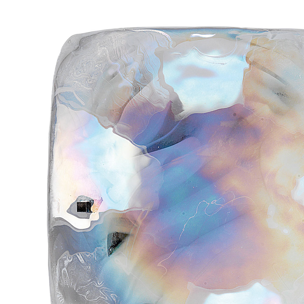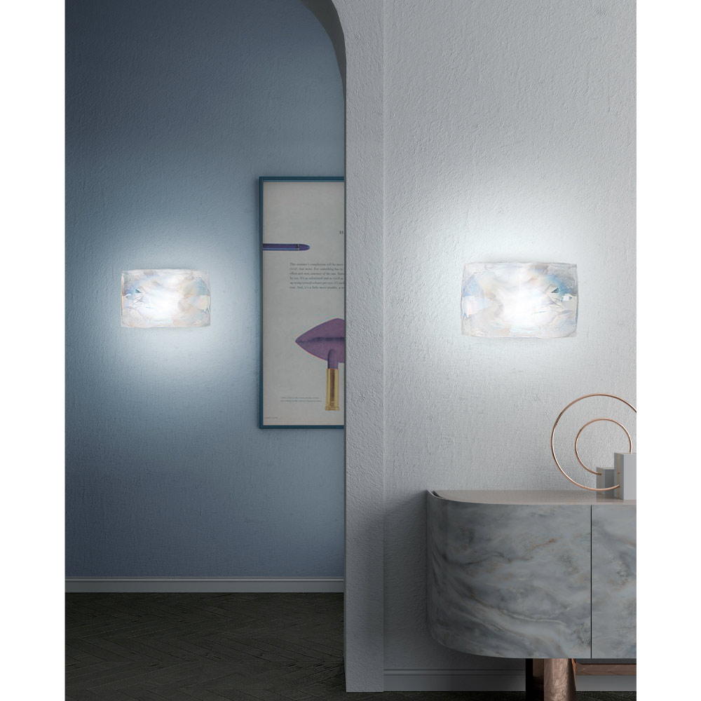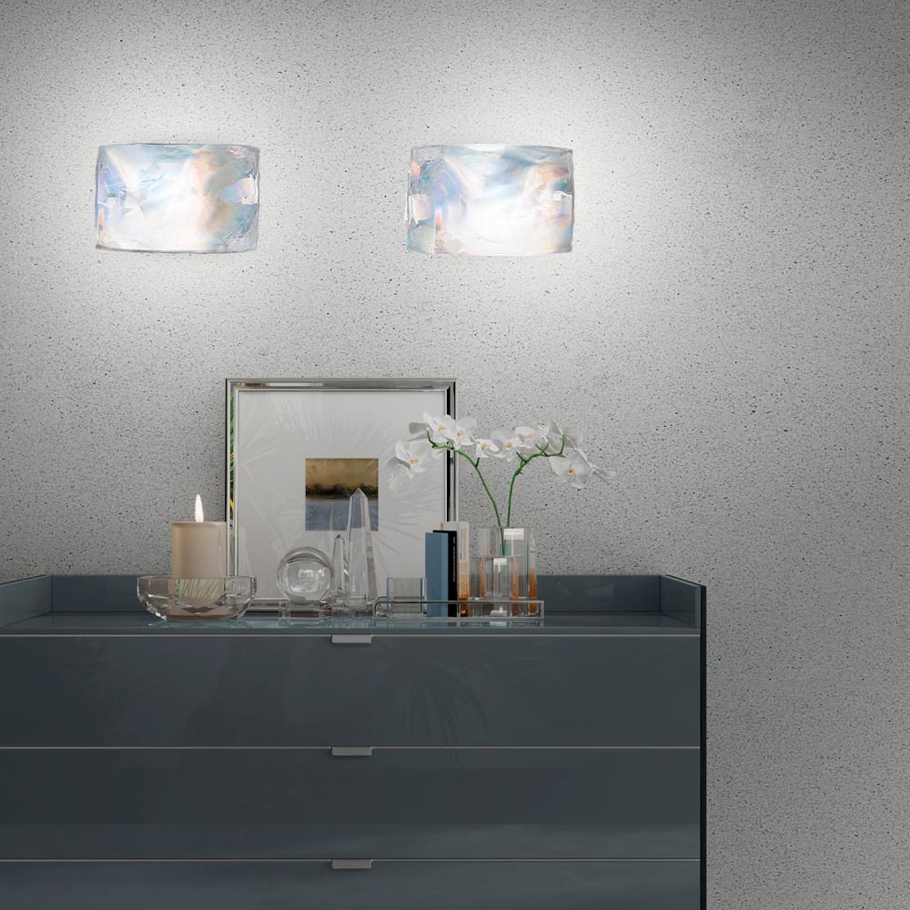 A small work of art with an intriguing aesthetic made of streaked white plate glass with iris decoration (mother of pearl effect) that gives the environment a touch of refined elegance thanks to the particular texture and the unprecedented visual effect created by the glass for a unique result with great personality.