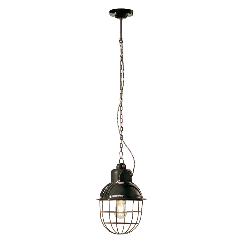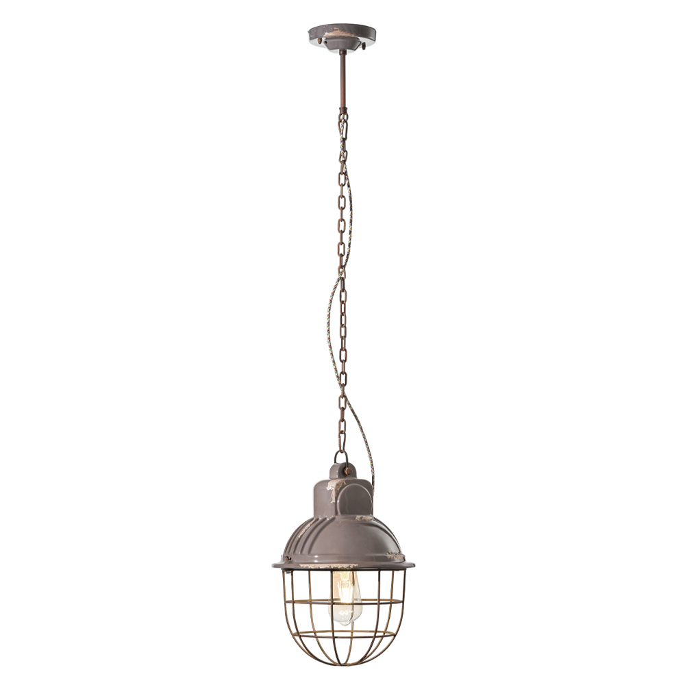 Suspended lamp in ceramic and iron with grid, various industrial finishes made in Italy by Ferroluce.
