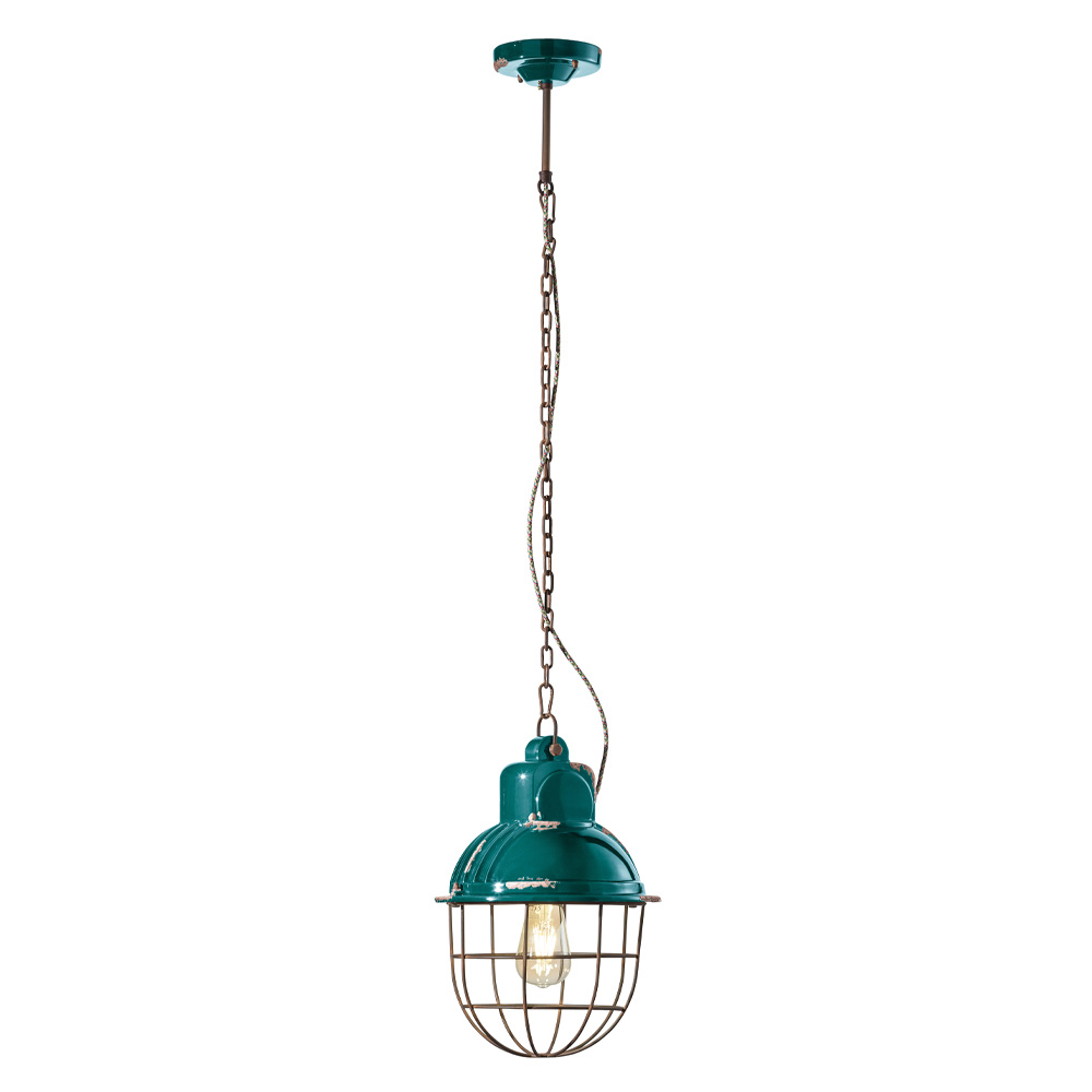 This suspension lamp is entirely handmade in iron and ceramic with a metal grid that protects the lighting body, highlighting the skill and manual skill of the craftsmen in a craftsmanship with attention to the smallest details.