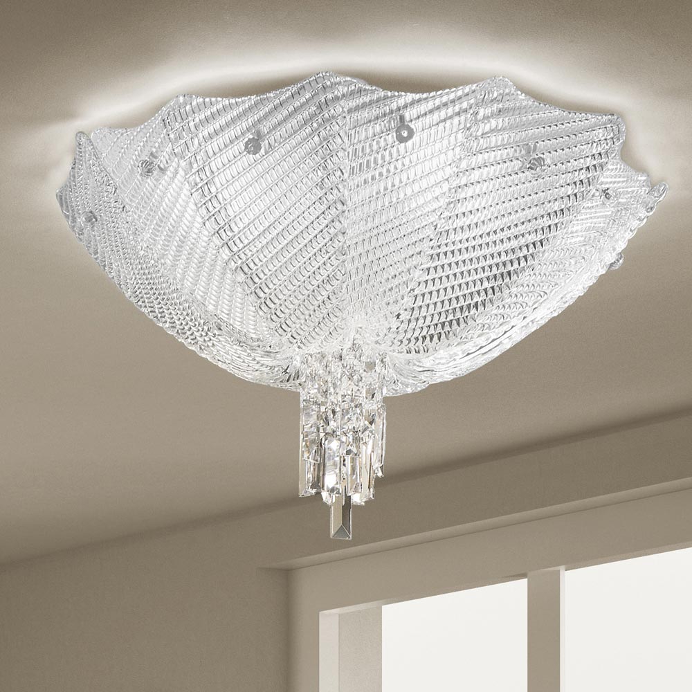 Ceiling lamp handmade in Venice glass with white metal details. A refined aesthetic with a strong visual impact that enchants thanks to the expressive force that characterizes its arched shapes obtained by means of the special processing with the plate technique. The wonderful geometric texture that covers the entire surface of the lamp is instead achieved thanks to the hot working of the glass which is also embellished with hanging prisms that emphasize and make the refraction of light unique for a unique, exclusive and refined result.