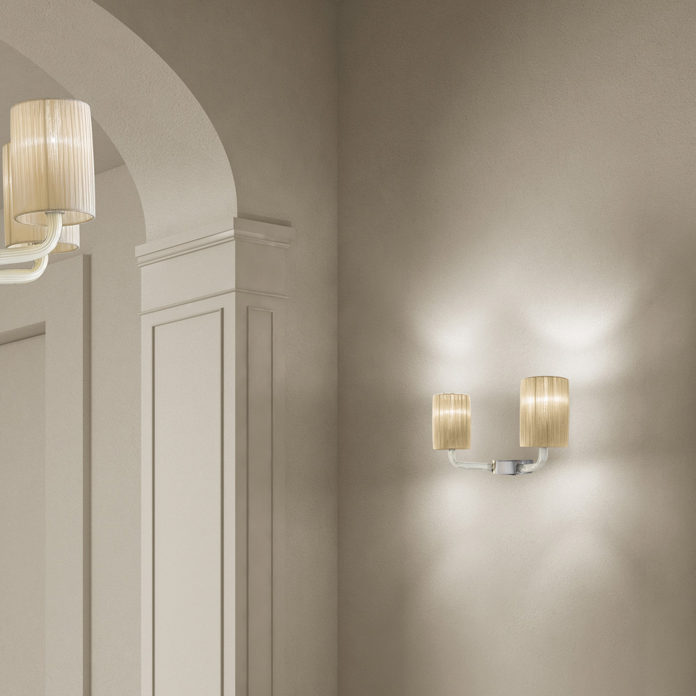Wall lamp in Venice glass with milk white-ivory finish handcrafted with metal details in shiny chrome finish and elegant fabric lampshades . A piece of furniture characterized by an articulated but essential design , able to enrich the environment giving character thanks to its strong stage presence typical of the classic chandeliers of the past. The tubular glass arms support in a delicate and classy way the wonderful fabric lampshades which help to carry the light in every direction for a warm , soft and enveloping lighting.