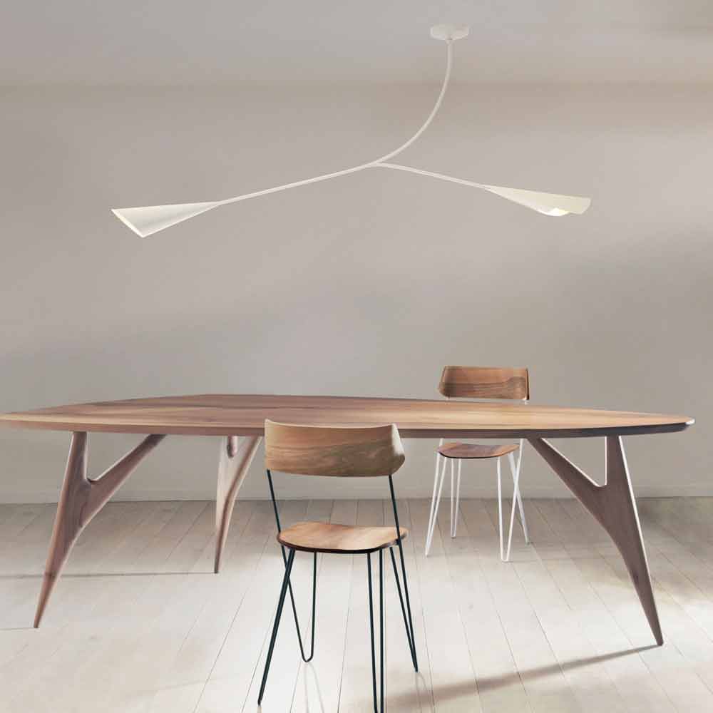Its design is inspired by nature with a clear reference to the elegant shape of the calla, exploiting the particular asymmetry of the stems and long cones to underline its light and delicate aesthetics. Its structure transmits a strong lighting potential and, thanks to its flexibility, offers the possibility of obtaining a diffused but easily directed light through a simple manual rotation, thus representing a valid alternative to the more classic reading lamps. Its important dimensions also make it a versatile solution, perfect both for environments such as kitchens where the dining table highlights, and for living rooms and bedrooms where it creates a warm and welcoming atmosphere ideal for dedicating oneself to relaxation.