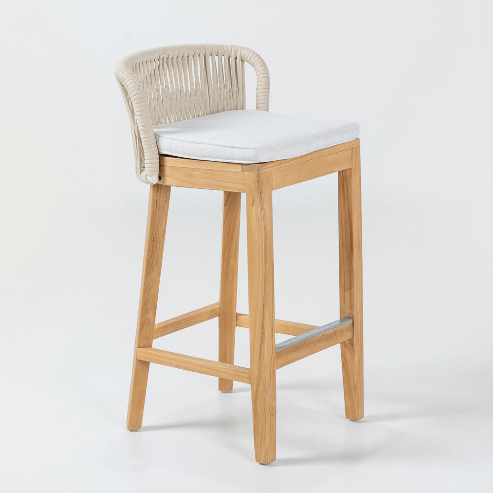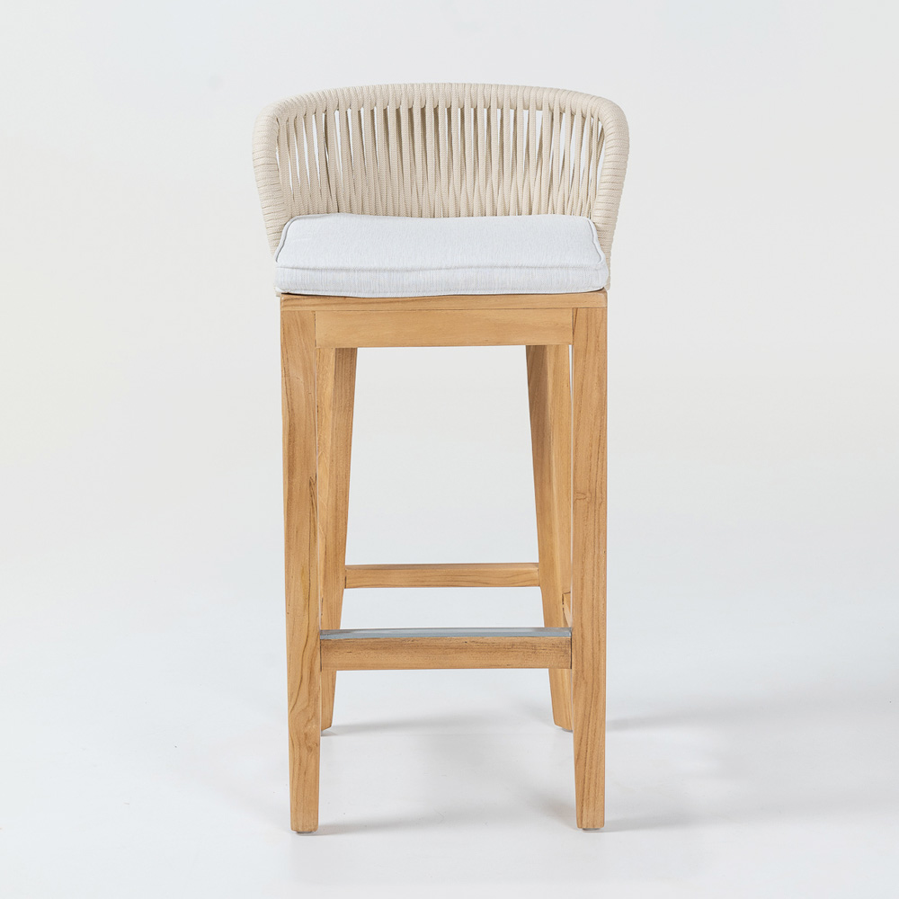 Elegant and versatile, this bar stool features a natural teak and aluminum frame , ensuring the perfect combination of strength and lightness . The Havana gray fabric cushion offers excellent comfort, while the Olefin/PP rope weave not only adds a touch of sophistication but is also weather-resistant, making it ideal for both indoor and outdoor use.