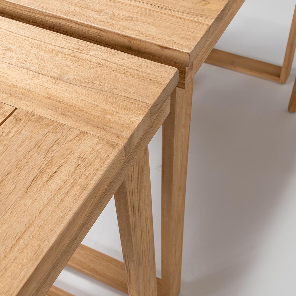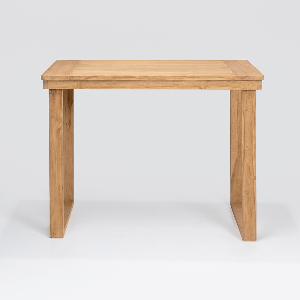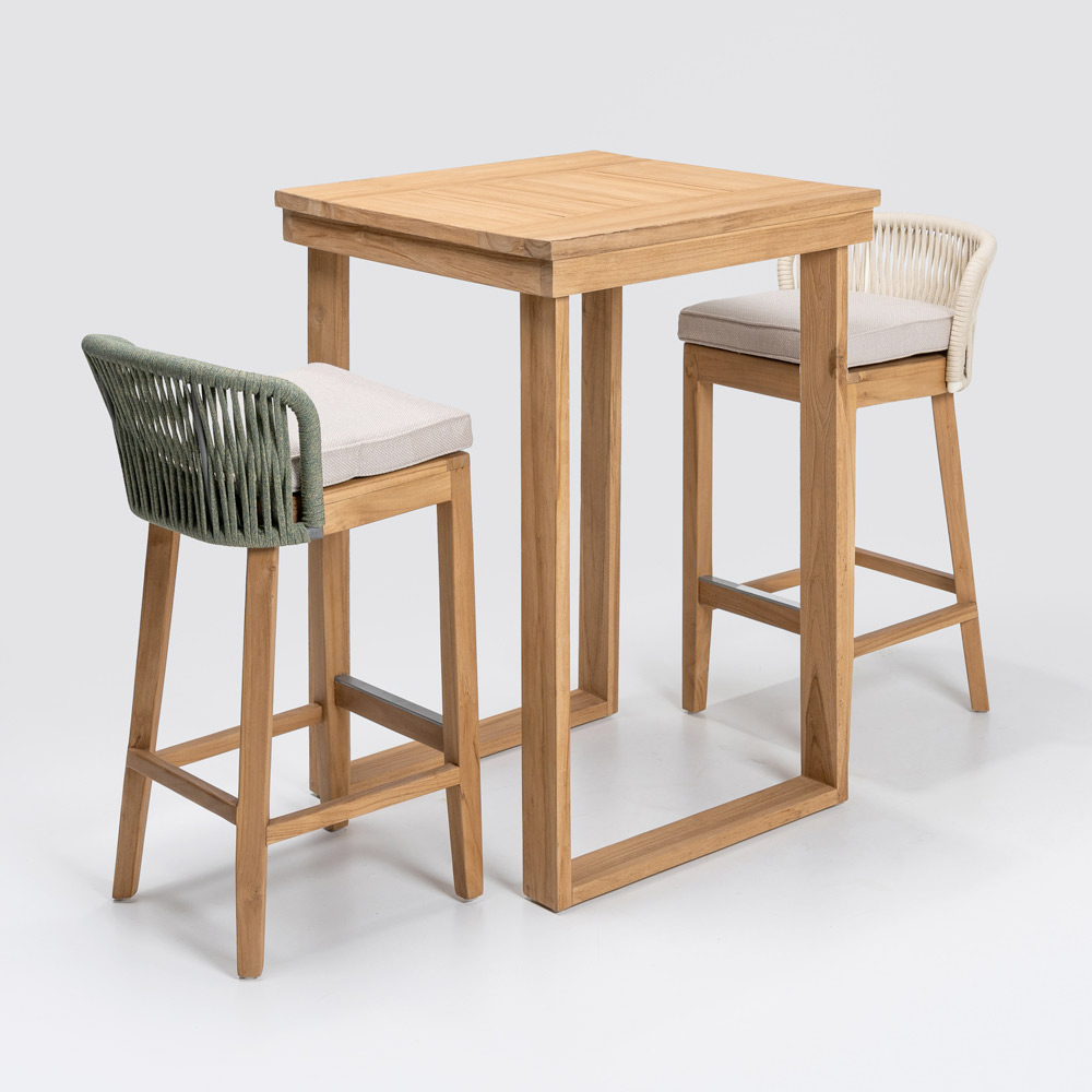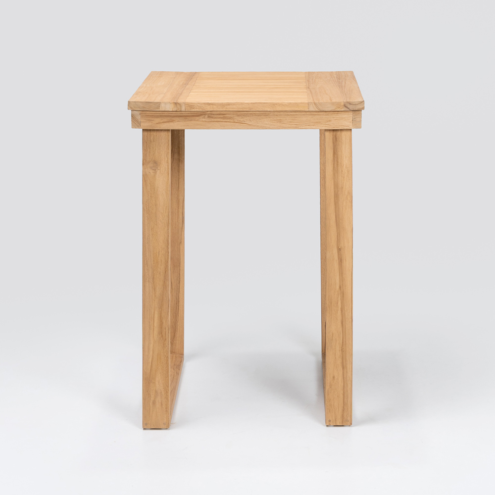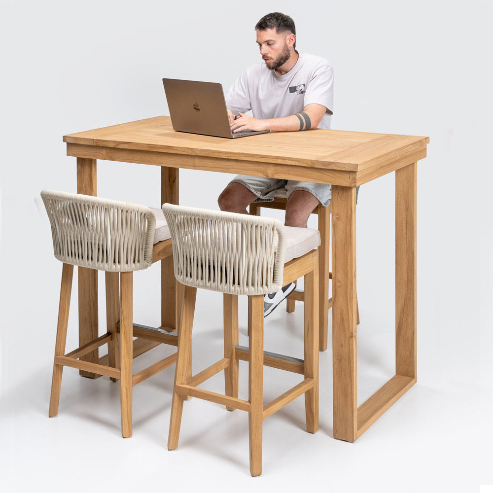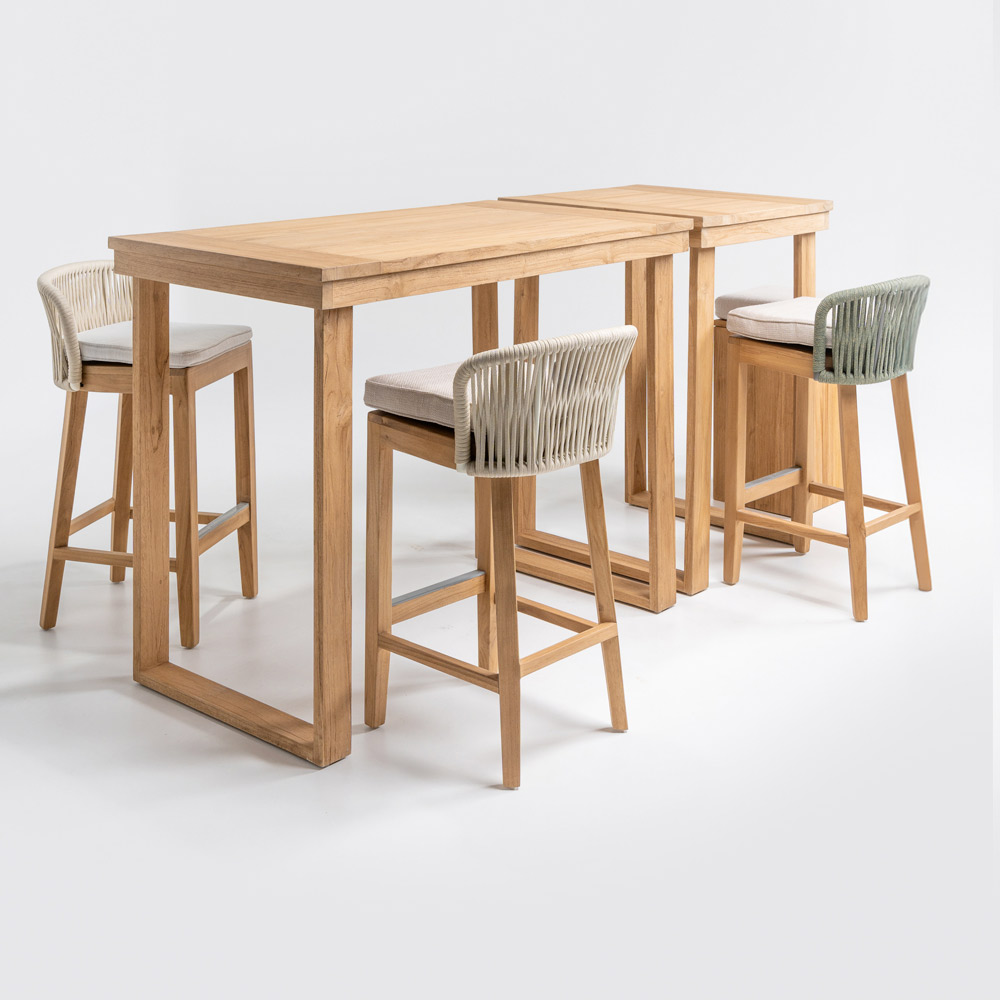 This elegant high bar table is the perfect combination of sophisticated design and natural materials . Crafted from a solid brushed natural teak frame , every detail is designed to ensure durability and resistance , while the brushed natural teak top offers a smooth and refined surface, enhancing the beauty of the wood with its unique grain .