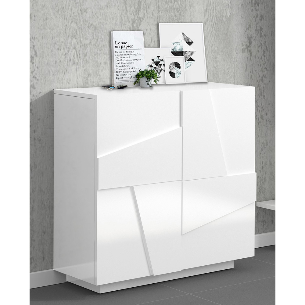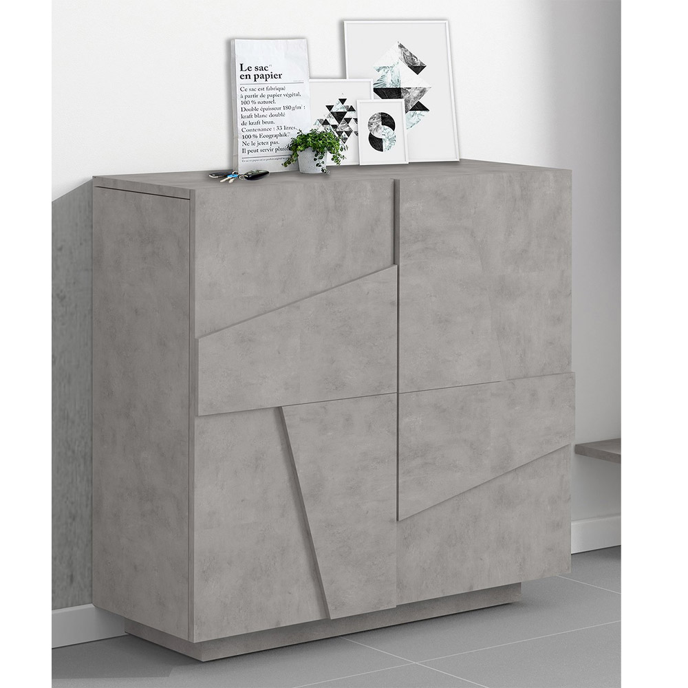 Made of sturdy and resistant melamine sustainable wood , it is available in two different heights with 2 or 4 doors a clean and handle-free look that gives the cabinet a particularly contemporary look, enriched by an oblique cut surface on the doors, for give a modern and original touch.