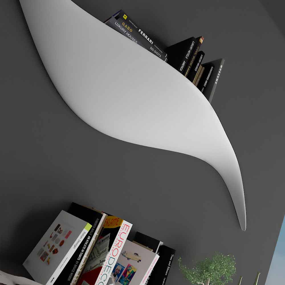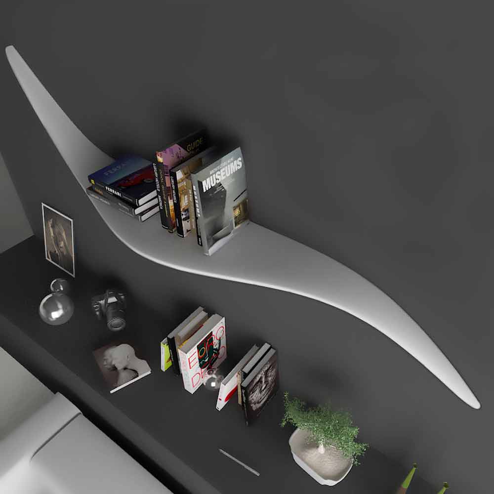 Modern design wall shelf made in Italy, Tuscania Tuscania is a wall shelf characterized by sweet and breathtaking lines. Made entirely of Solid Surface® resin, it will be perfect to be placed in any environment, giving design and elegance.