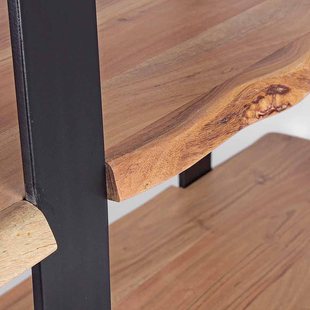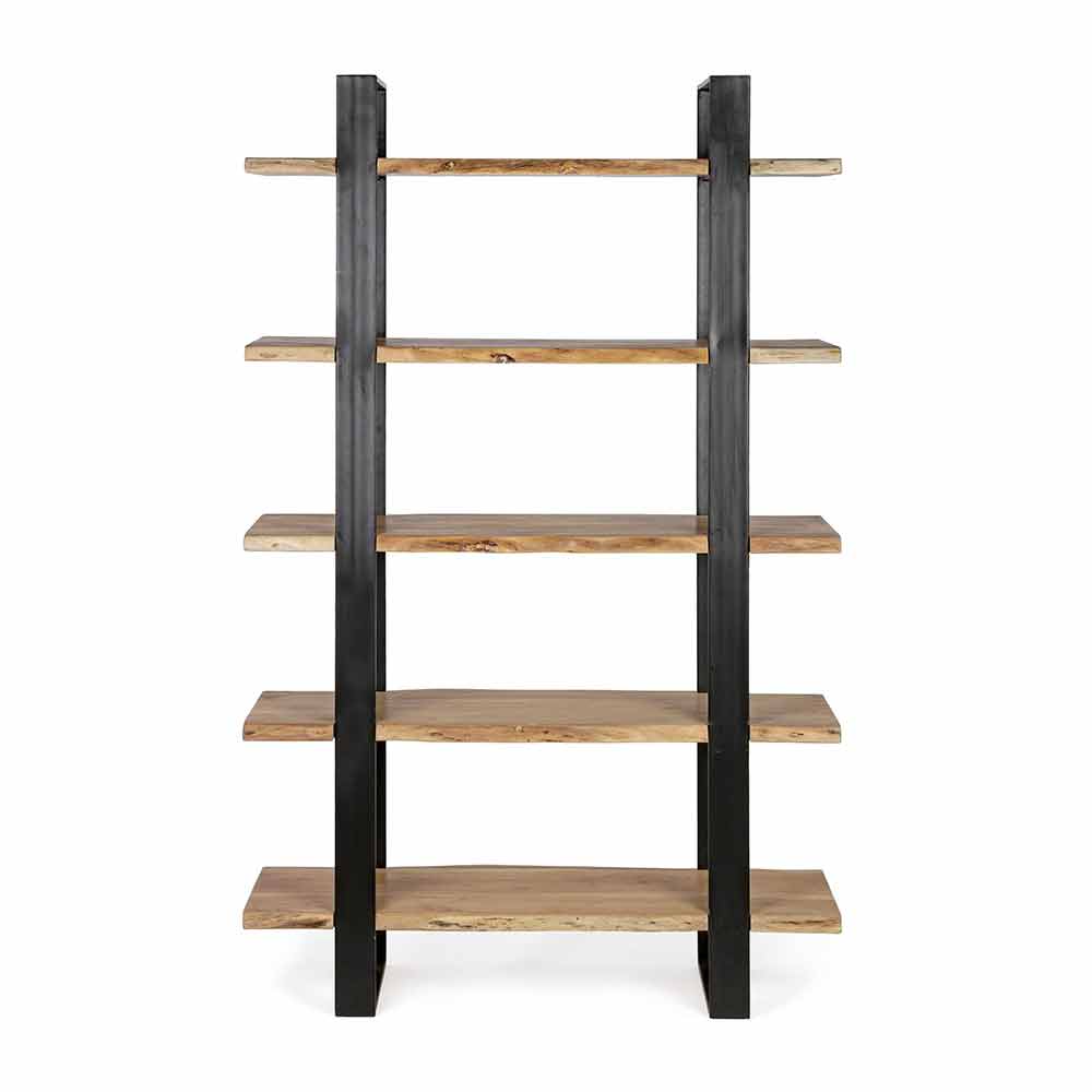 Modern design floor bookcase in painted steel and acacia wood.