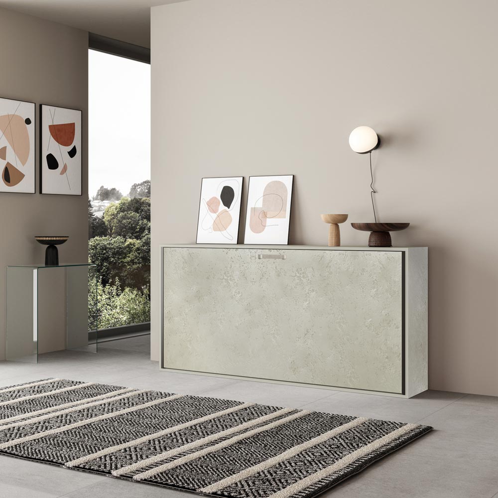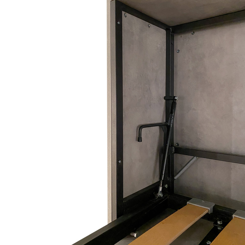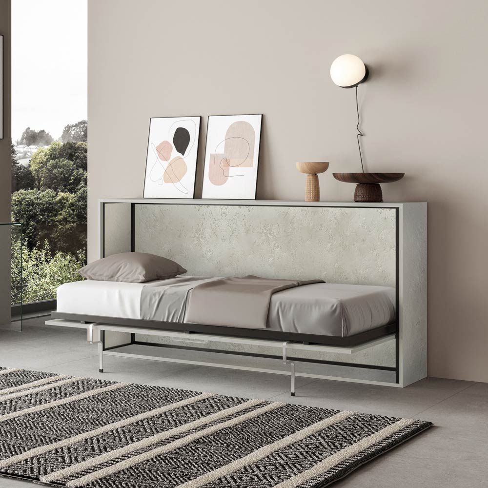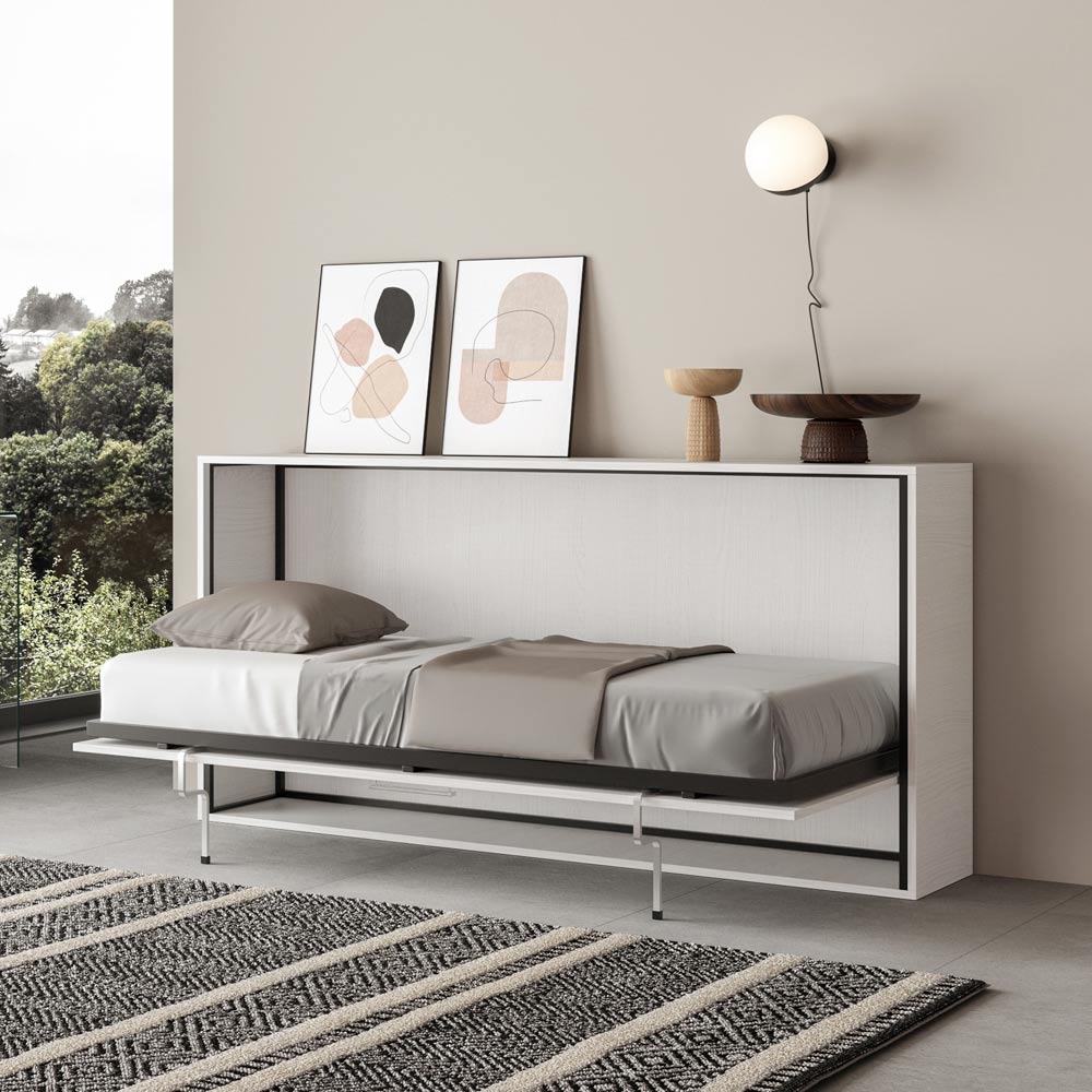 Horizontal foldaway bed made with a structure in 18 mm thick ennobled particle board panels, bed base structure in reinforced iron painted with epoxy powder in embossed aluminium colour. The opening mechanism is equipped with an anti-closure system with safety lock with lateral release handles. The bed remains stable thanks to an internal safety mechanism that ensures its rigidity. When opening, the foot must be manually extracted to allow the bed base to rest on the ground. The lowering of the bed is facilitated by the included handle. Includes orthopedic base made of 85x190 cm laminated wood slats with mattress straps.